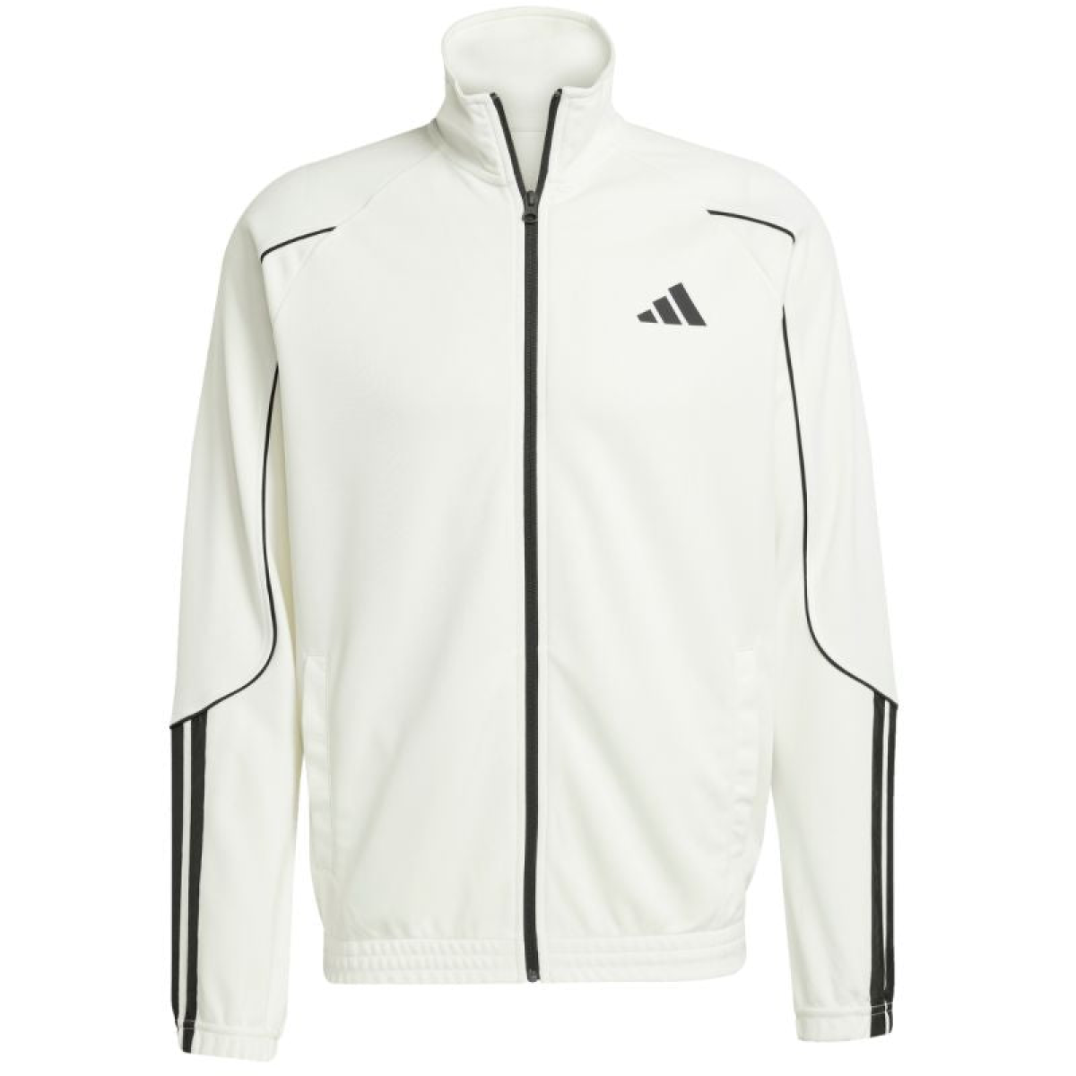 Men's adidas 3-Stripes Tracksuit, White and Black JX5527. This adidas tracksuit is designed for men. It's perfect for soccer training or relaxing off the pitch. The zip-up sweatshirt features a stand-up collar. The regular fit is finished with elastic cuffs. The sweatpants have an elastic waistband with a drawstring. The sweatshirt has pockets. The tracksuit is made of quick-drying recycled polyester. Material: 100% recycled polyester