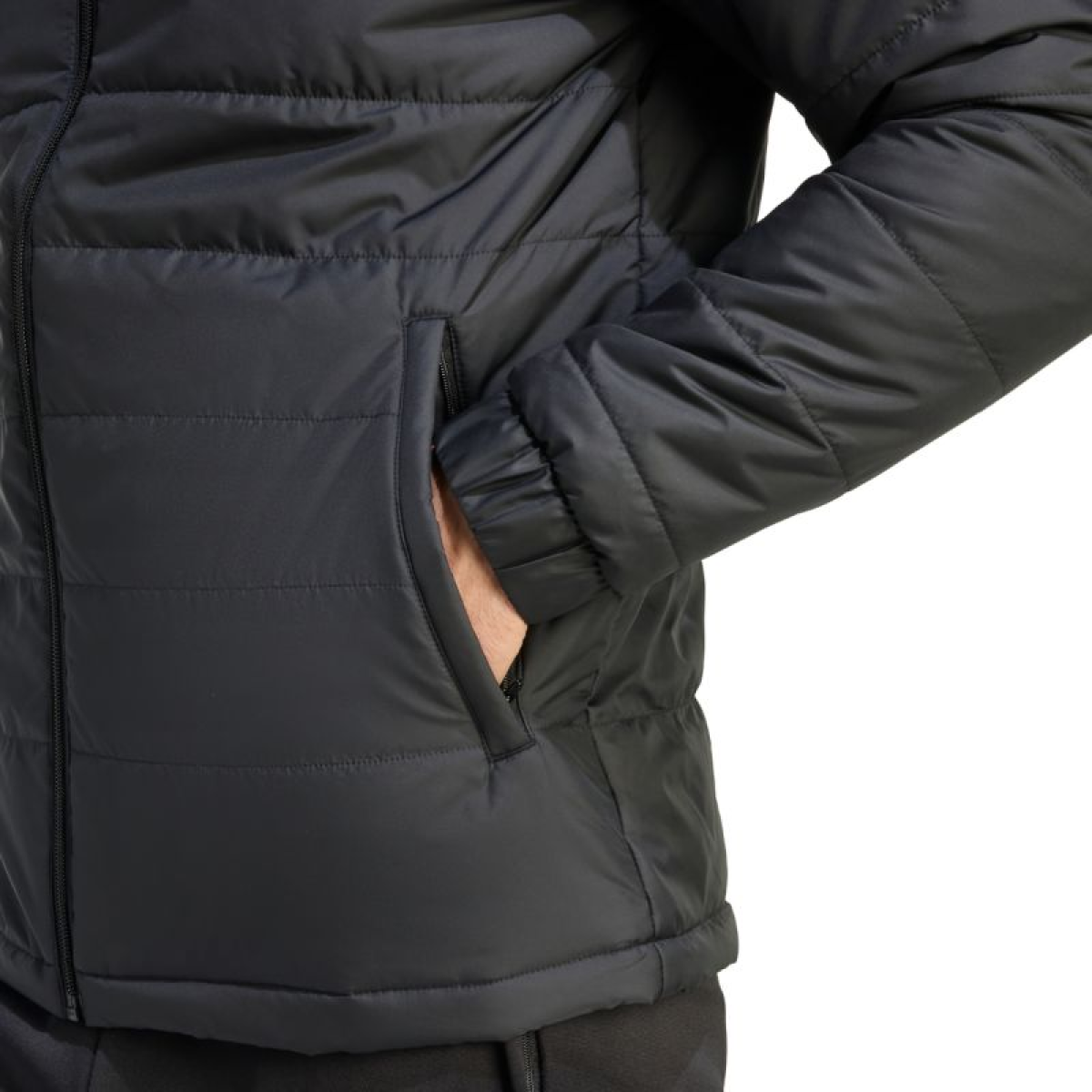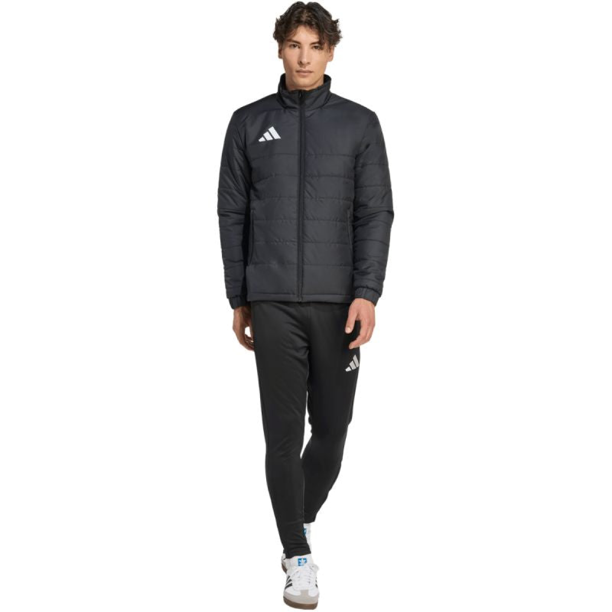 adidas Entrada 26 Light Men's Jacket, Black JZ9141. This adidas men's jacket lets you show off your football style no matter where you go. Quilted construction with evenly distributed synthetic fill. Standard fit. Full-length zipper. Zippered side pockets. Elastic cuffs. Material: 100% recycled polyester