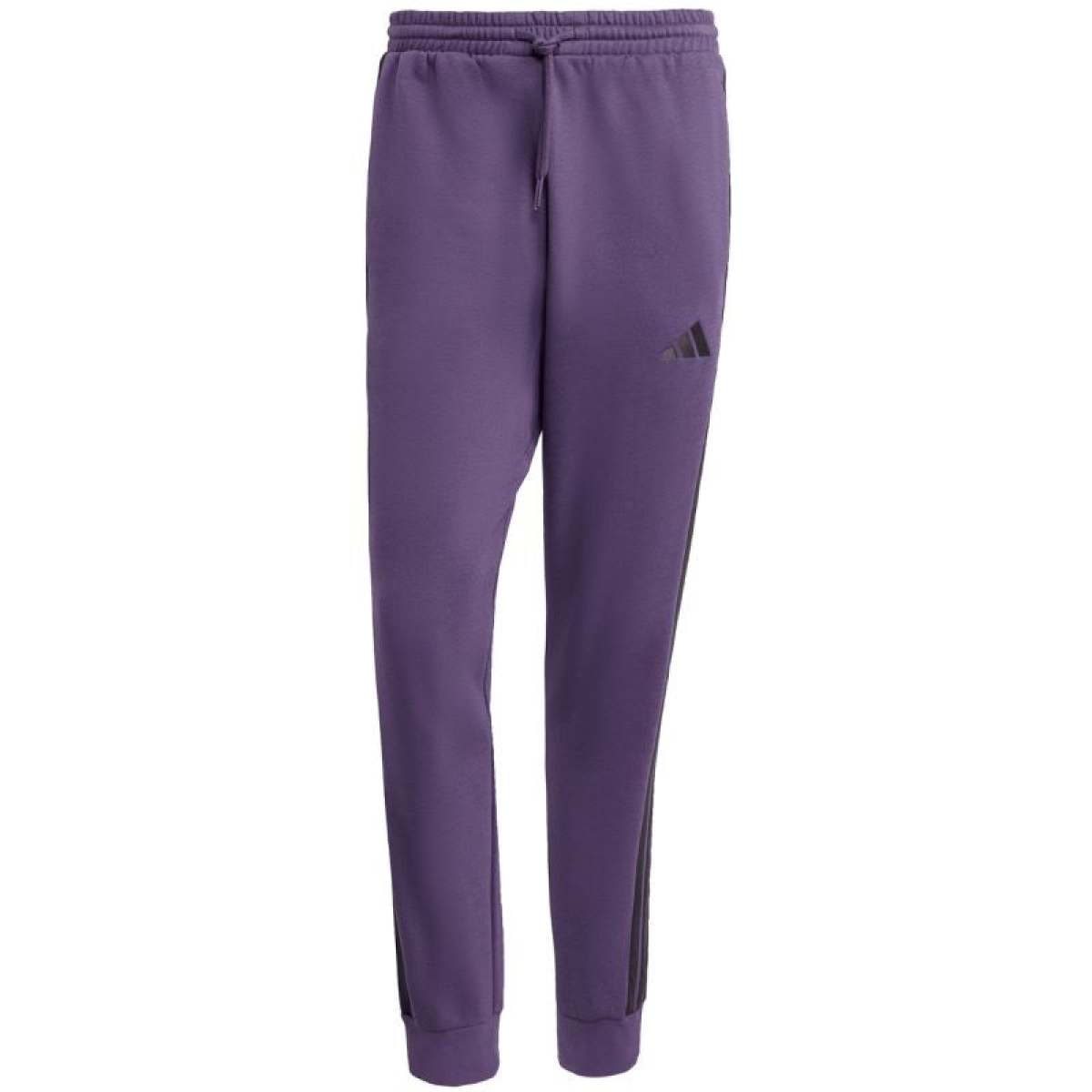 Men's adidas Essentials 3-Stripes Fleece Pants Purple JX0750. These men's adidas pants with tapered legs offer unrestricted movement, ensuring full mobility and comfort in every position. The soft-touch blend of cotton and polyester provides internal padding. Elastic cuffs at the lower legs. Waistband with an external drawstring for adjustment. Open pockets. Sporty design with stripes on the legs and a discreet adidas logo. Material: 55% cotton, 36% recycled polyester, 9% viscose