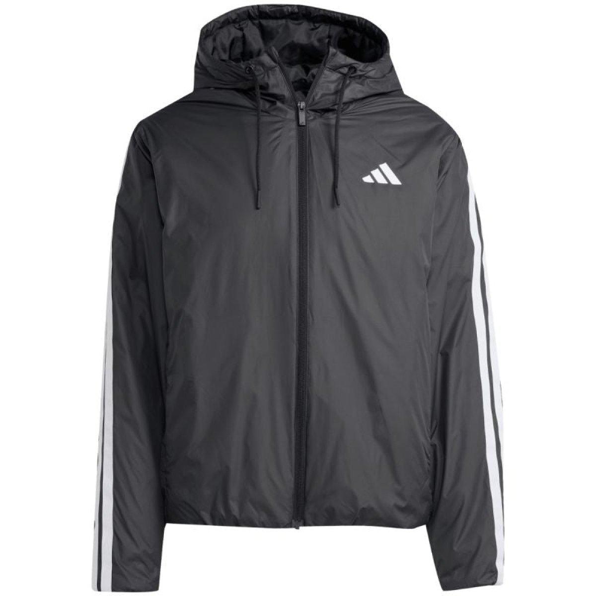 adidas Essentials Climawarm 3-Stripes Insulated Hooded Men's Jacket, Black JM4042. This mid-weight adidas men's jacket is perfect for transitional periods. Durable polyester construction. DWR-coated fabric reduces moisture absorption. Climawarm technology retains heat and wicks away sweat for comfort. Synthetic fill. Regular fit. Full-length zipper. Front snap pockets. Fixed hood with drawcord adjustment. Elastic cuffs and hem. This model is made from a series of recycled materials and contains 100% recycled content, just one of the proposed solutions that can help end plastic waste. Specifications: Material: 100% recycled polyester. Filling: 100% polyester (synthetic down).