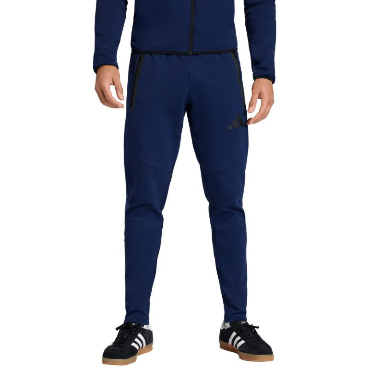 adidas Tiro 26 Travel Sweat Pant Navy Blue KF6073. These adidas men's pants, part of the Tiro line, are perfect for relaxing between training sessions. A blend of breathable cotton and durable polyester fibers. Regular fit. Elastic waistband with an internal drawstring. Zippered side pockets. Tapered legs with zippers. Material: 70% cotton, 30% recycled polyester