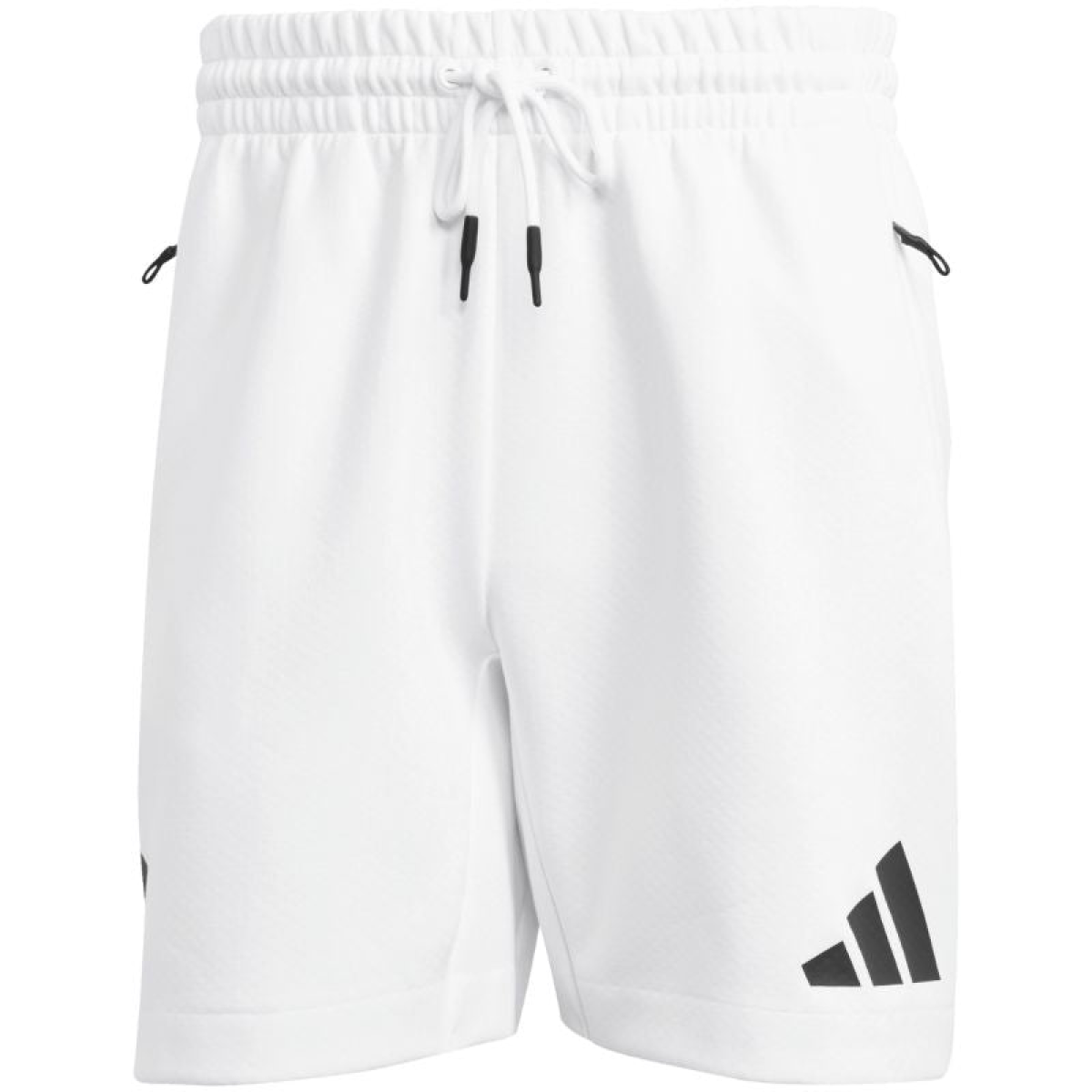 adidas ZNE Men's Shorts JJ4893 White. Sporty adidas shorts for active men who value functionality and a sporty spirit. Regular fit. Elastic waistband with drawstring. Mid-rise waist. Front zip pockets. Three-layer fabric. Design with rubberized accents. Material: 57% recycled polyester, 43% cotton