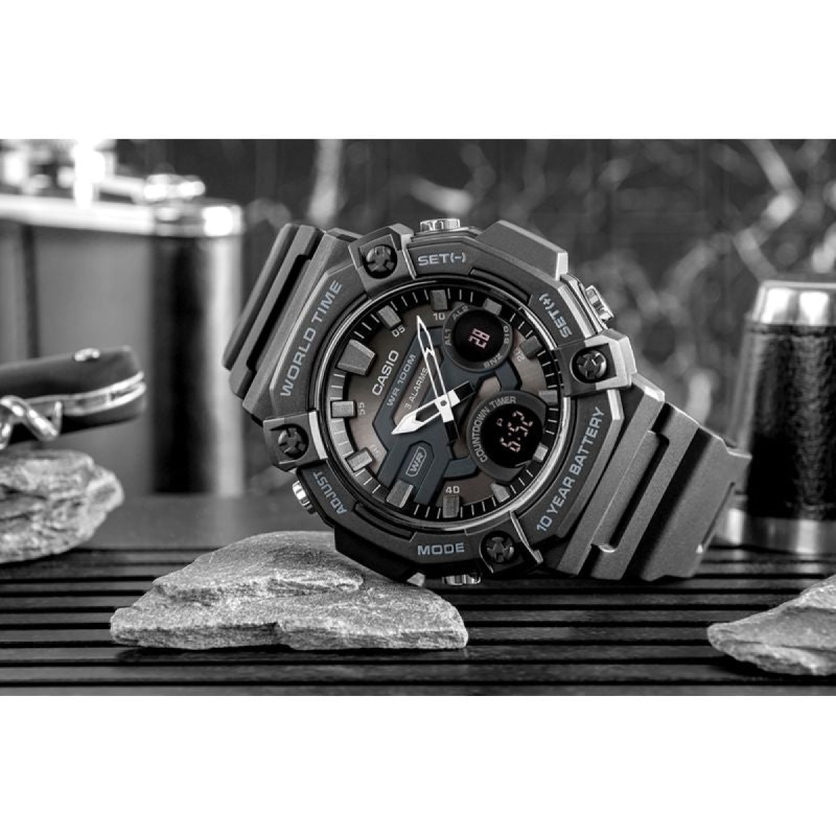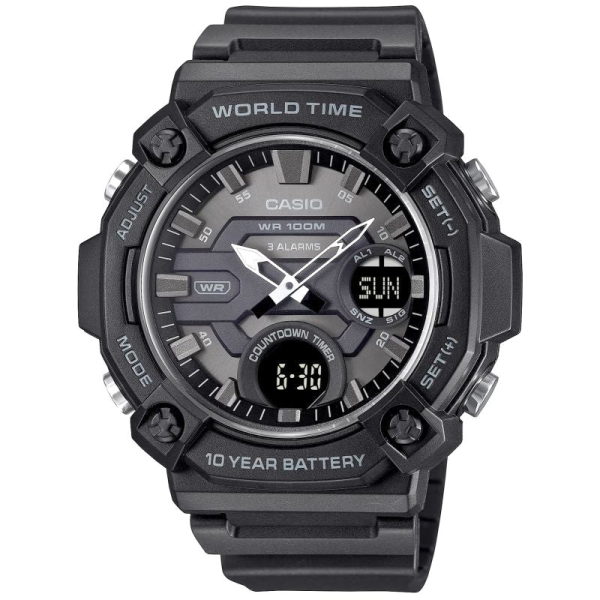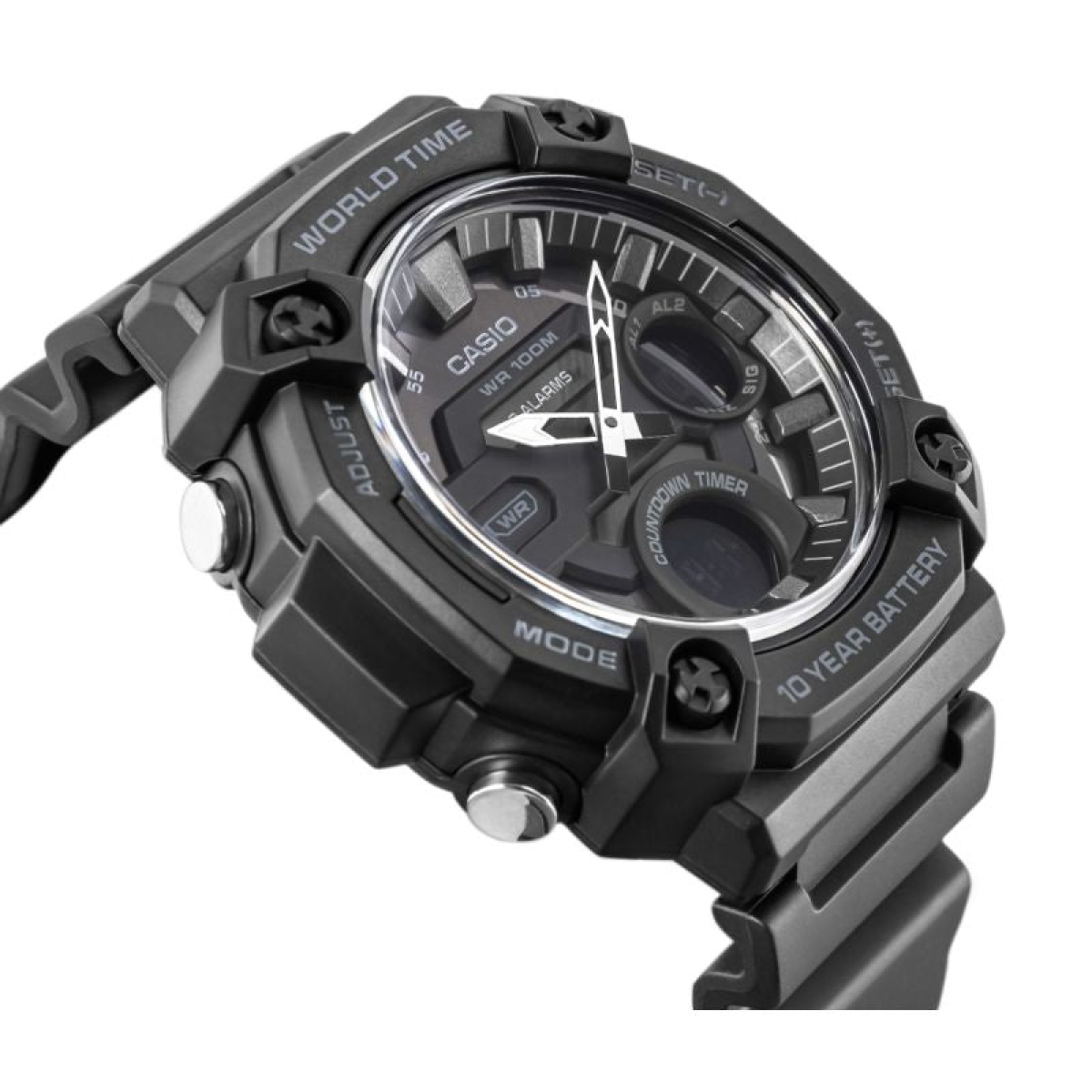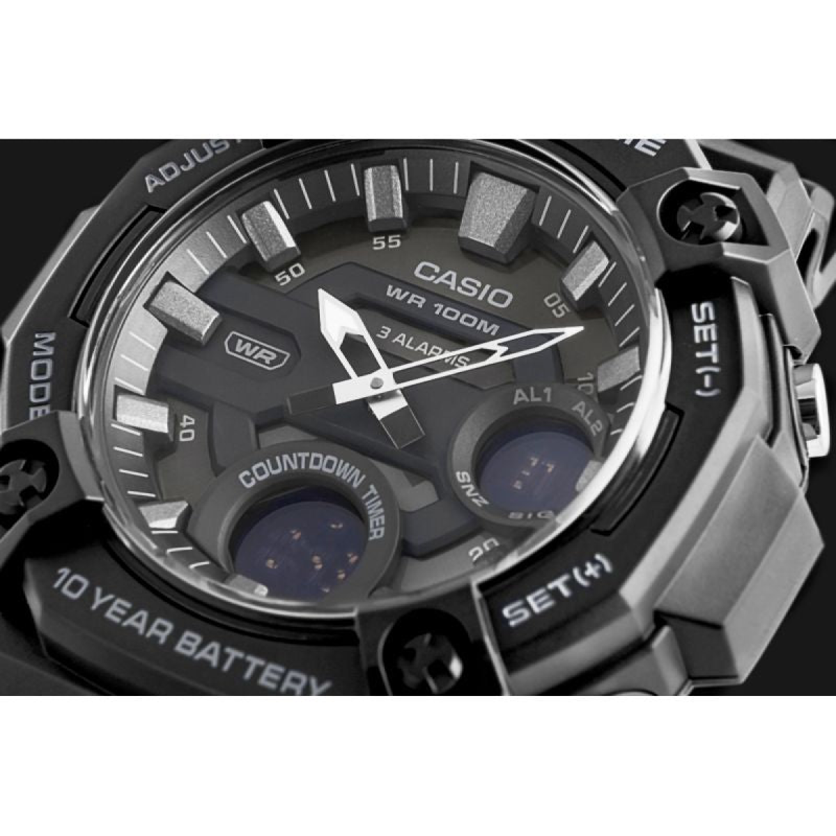 Combine functionality with adventure-readiness with the CASIO AEQ-120W watch, featuring a distinctive, robust design and oversized case. The large bezel and convex dial ensure excellent readability and emphasize the watch's masculine, decisive character. Water resistance to 100 meters and a battery life of up to 10 years guarantee reliability. Additional features such as three alarms, a timer, and a world time keep you in control of your day—no matter where you are. TELEMEMO (30 entries) is a practical solution that allows you to store important contacts without having to use your phone, which is especially useful in emergencies or during outdoor activities. Additionally, this function offers a display informing about available memory and automatic sorting of stored data.