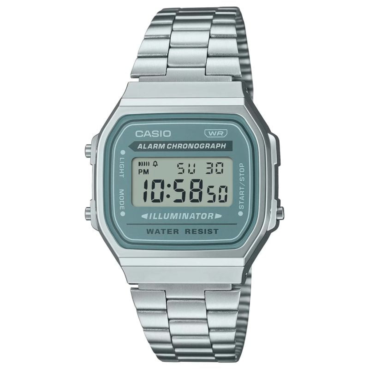This watch isn't just a timekeeper—it's a statement of style. With the Vintage collection, CASIO brings to the modern era the atmosphere of bygone days, when design had soul and simplicity meant class. The dial, framed by a subtly shimmering chrome case, evokes associations with industrial elegance—raw yet refined. The square shape and geometric purity of form give it a character—subtle yet expressive. Thanks to its compact dimensions and lightweight construction (just 50g), it almost blends with the wrist, providing a feeling of natural comfort. This model features standard digital time display: hour, minute, second, time of day (PM), date, and day of the week. And when the moment comes, it has everything you need. A 1/100-second stopwatch , split time function, daily alarm, and hourly time signal—practical tools in a sleek design. In the evening, when the light dims, just one press is enough – the electroluminescent blue-green backlight will brighten the dial and give it a unique atmosphere.