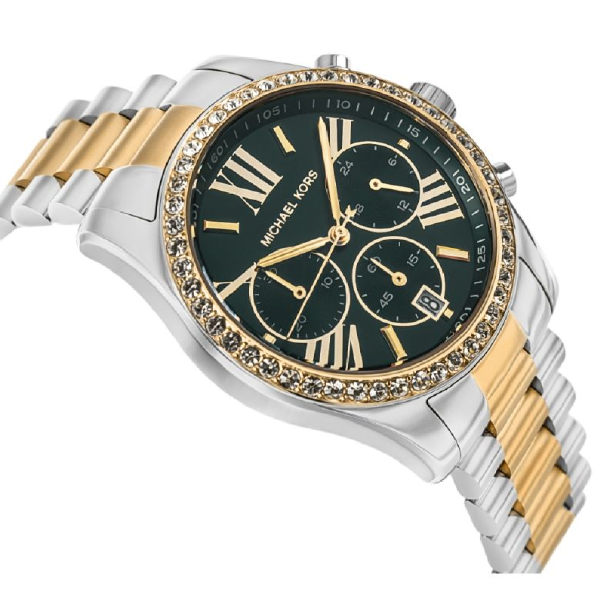 The Michael Kors Lexington MK7303 Women's Watch is the epitome of luxury and timeless style. Styled in classic silver and gold, it captivates with its subtle sparkle and elegant finish. The round case and matching stainless steel bracelet create a cohesive, jewel-like ensemble that will add a touch of class to any outfit. The green dial with indices and a chronograph function combines style and practicality, while the decorative bezel around the dial adds a unique touch. Powered by a precise quartz movement, the Michael Kors Lexington MK7303 guarantees reliable performance day after day. It's the perfect choice for women who appreciate a touch of class—elegant, sophisticated, and always fashionable.