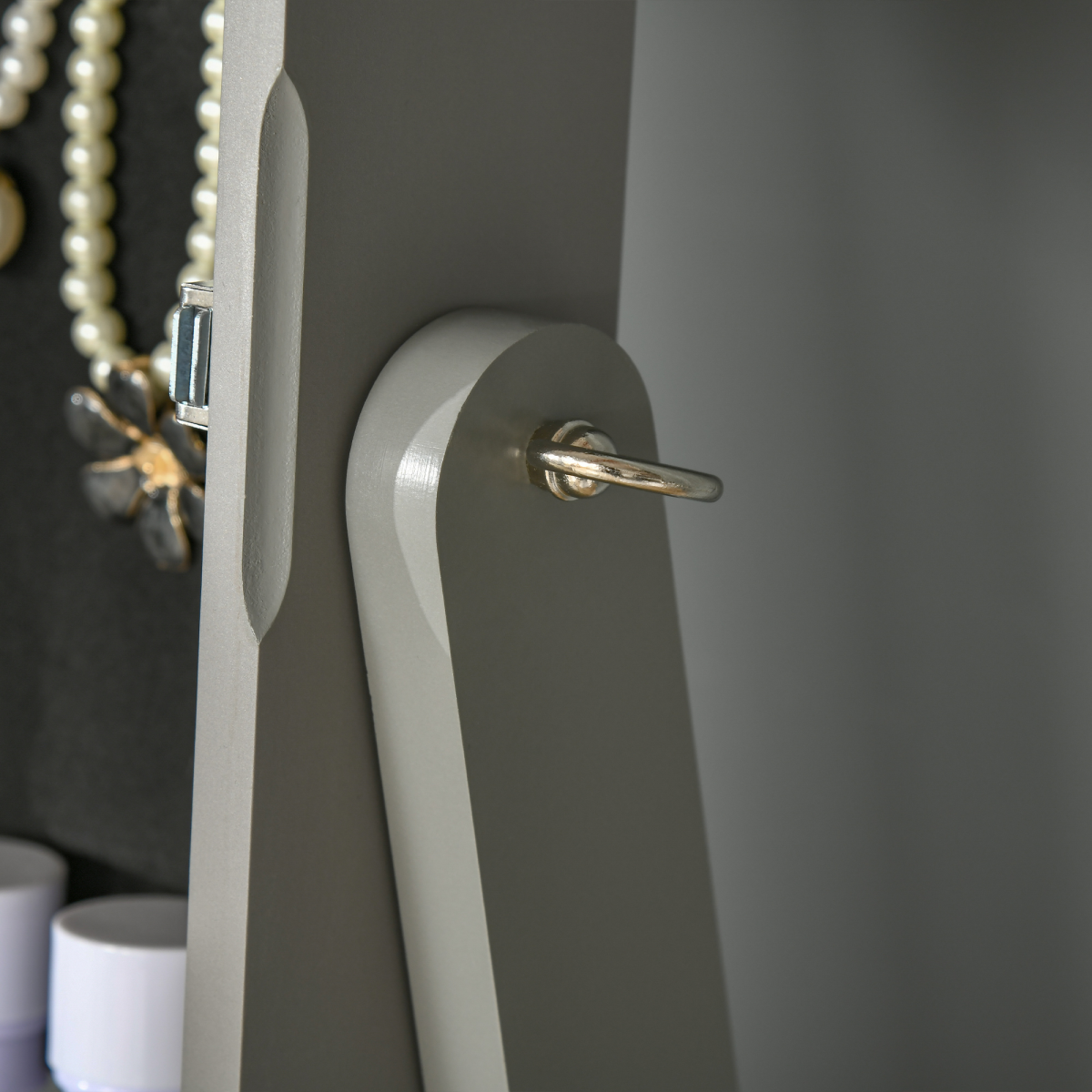 FREESTANDING: Jewellery armoire design - the sleek and stylish way to organise your silver and gold ware, accessories and more.ADJUSTABLE MIRROR: Four different angles, easy to get ready in a position best for you. Longline size - you can see plenty of your outfit.STORAGE: 100 earring slots, bracelet hanger, 24 necklace hooks, 105 ring slots and four shelves, keeps everything safely together. Lockable, with two keys included.LARGE BASE: Two feet stand the mirror steady, keeps it balanced.DIMENSIONS: 151.5H x 46W x 36.5Dcm. Mirror: 105L x 33Wcm. ASSEMBLY REQUIRED.