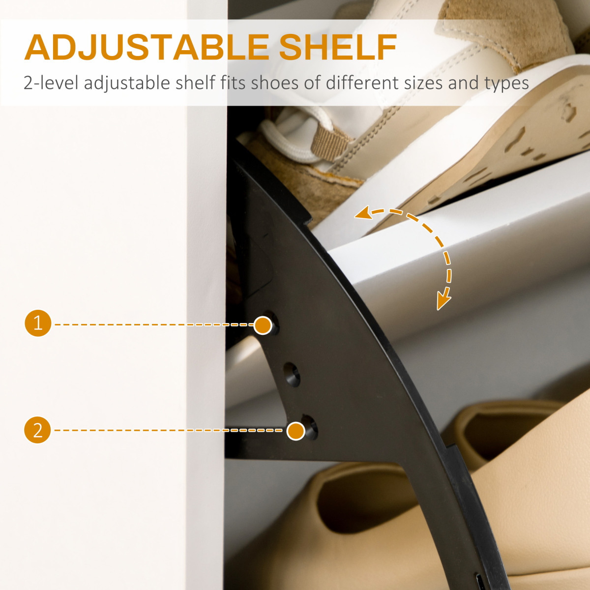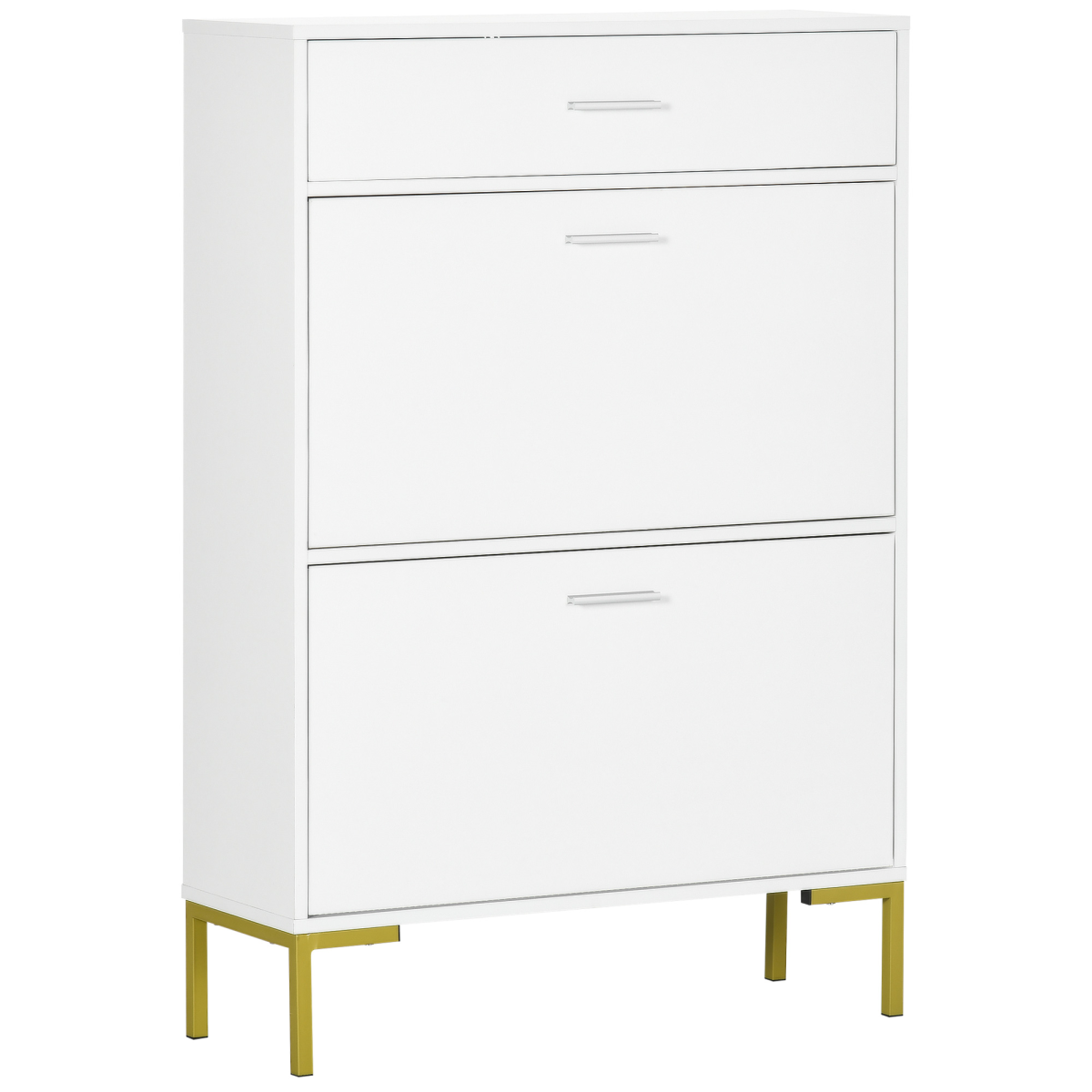 Storage: Shoe storage cabinet features two flip drawers and top drawer. Adjustable shelf in flip drawers to fit different-sized shoes. Shoe organiser can hold approx. 12 pairs.Elegant design: A white shoe cabinet with gold coloured feet - a simple colourway with a touch of sophistication. Looks beautiful everywhere.Sturdy: Particleboard and MDF blend for a hallway storage unit which is sturdy and suitable for every day use. Anti-tipping straps for safety.Narrow storage cabinet: Tall and slim design makes this shoe storage unit suitable for fitting in smaller spaces.Dimensions: 110H x 76W x 26Dcm. Maximum load 20kg. Assembly required.