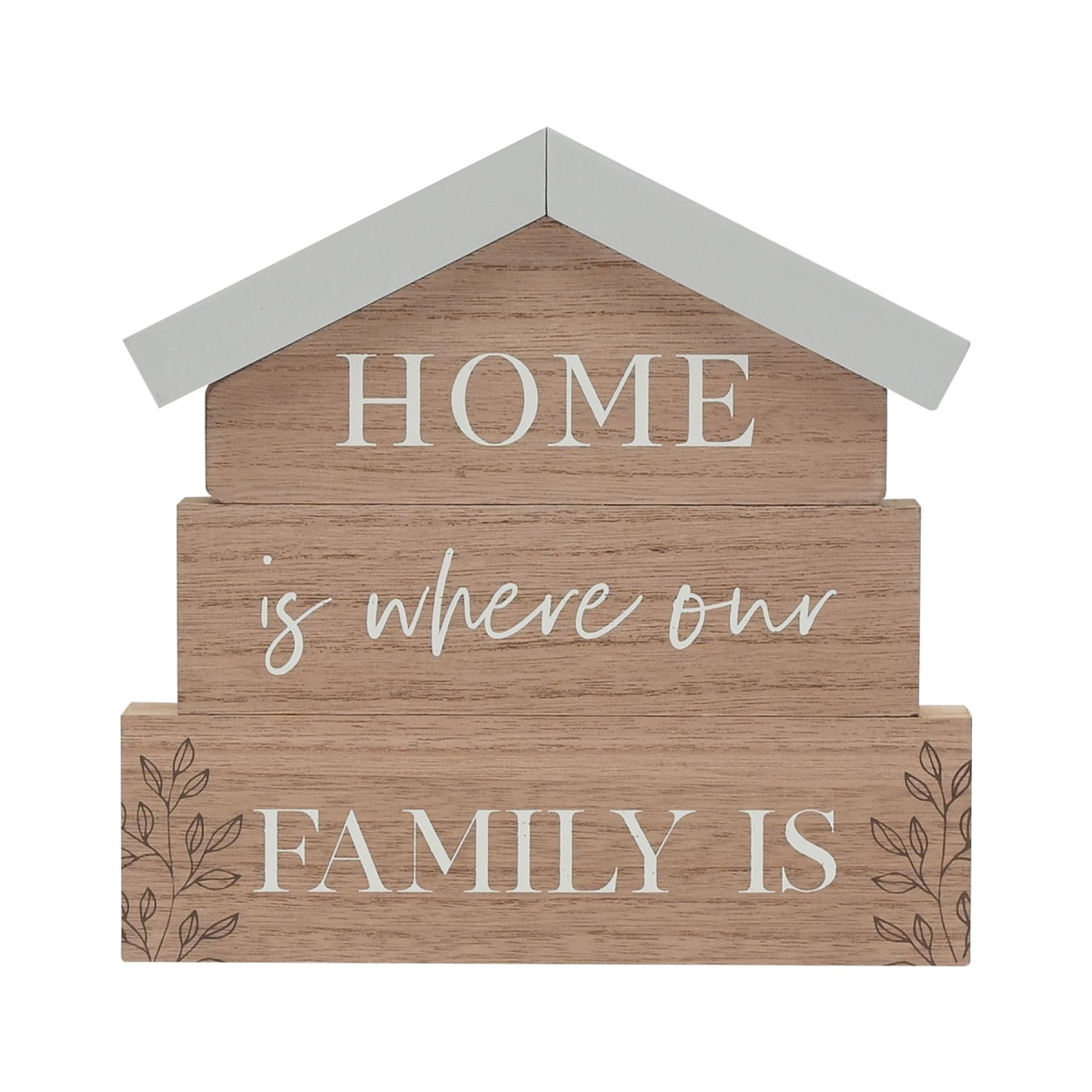 The towered wooden mantel plaque showcases three levels which create a house design, complete with roof, �Home Is Where Our Heart Is� title and printed foliage design. It is designed for freestanding display.