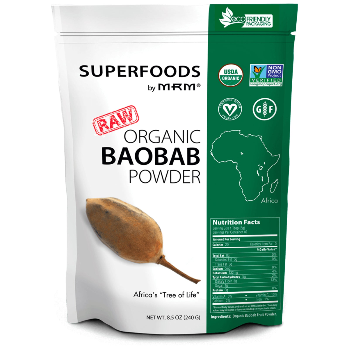 EcoFriendly Packaging Superfoods by MRM Raw USDA Non-GMO Project Verified Certified Vegan Gluten Free Africa's "Tree of Life" Inspired by Nature Est. 1996 Supported by Science Certified by EcoCert ICO Untouched nature mesmerizes me how it lives in harmony within itself; plants, animals and microorganisms, all intertwined in a sometimes chaotic yet cyclical unity. This perspective shaped my childhood and evolved into a quest for knowledge of ethnobotany (study of the relationships between peoples and plants). I'm humbled that this exploration allowed me to build a line of natural health products. At MRM, we are inspired by nature and utilize science as a tool to learn, incorporate, support and educate what the natural world has to offer. Respectfully, these Superfoods are the foods our ancestors thrived on, not today's foods we survive on. Many Thanks, Mark Olson Founder of MRM What is Baobab? Name:Baobab, Adansonia digitata, aka "Upside Down Tree" Country of Origin:India Climate:Tropics and sub-tropics Plant Part Used:Fruit Nutrients:Antioxidants, Fiber, Potassium, Calcium, Magnesium, Vitamin C Ethnobotany:Nutrient dense whole food complex. Africans use all parts of the Tree for medicine, food, rope and clothing. , Non-GMO, Vegan & Gluten-free Naturally Dehydrated Fruit Pulp Source of Fiber & Antioxidant Protection Contains Vitamin C, Magnesium, Potassium, & Calcium Great Addition to Smoothies & Drink Mixes What is Baobab? The baobab fruit naturally dried on the tree, where the delicious fruit pulp is protected within its hard inedible shell. The dry fruit pulp is carefully separated from the shell and made into a nutrient dense powder. There is no heat treatment or extraction process, leaving a pure nutritious whole fruit powder with a sweet, tangy citrus-like flavor. This fruit powder offers valuable fiber and antioxidants beneficial to a healthy lifestyle. It provides Vitamin C and the macrominerals magnesium, potassium and calcium as a superfood would. Baobab is a truly ancient and treasured food in Africa which has remained unaltered by human intervention and cultivation. This product is both ethically and sustainably sourced as it is harvested using global best-practiced forestry techniques ensuring a long term abundant supply and stable income for the local families and communities in southern Africa. This sweet, tangy fruit powder is ideal for adding to yogurt, smoothies, drink mixes, and baked goods for a uniquely delicious treat. With its fiber content including pectin, it can be made to thicken jams, jellies, hot cereals, and soups. Benefits Macrominerals, such calcium, magnesium and potassium, are important electrolytes which our bodies need large amounts of. These minerals offer support to maintain our structural systems such as muscle and bone health. Vitaminn C is an important nutrient to be included in a healthy diet. It can assist in proper immune function and provide antioxidant protection. Antioxidants address the free radicals in the body which can be damaging as they can disrupt the structure and stability of many crucial factors. Obtaining sufficient fiber in one’s diet is important as it supports digestive functions. Fiber also offers a useful satiety effect when maintaining a healthy lifestyle. Source Found on the continent of Africa, the baobab tree grows in tropical and subtropical climates and can reach astounding ages of over 1,000 years. The baobab tree is rich in legend and myth in Africa, and is called the ‘Tree of Life’ as many habitants, animal and human, of the arid regions of Africa rely on the baobab for its abundant resources. The large trunk of the Baobab tree can become hollow, while continuing to produce fruit, many times converted into post offices, bush pubs and jails, amongst other resourceful uses.
