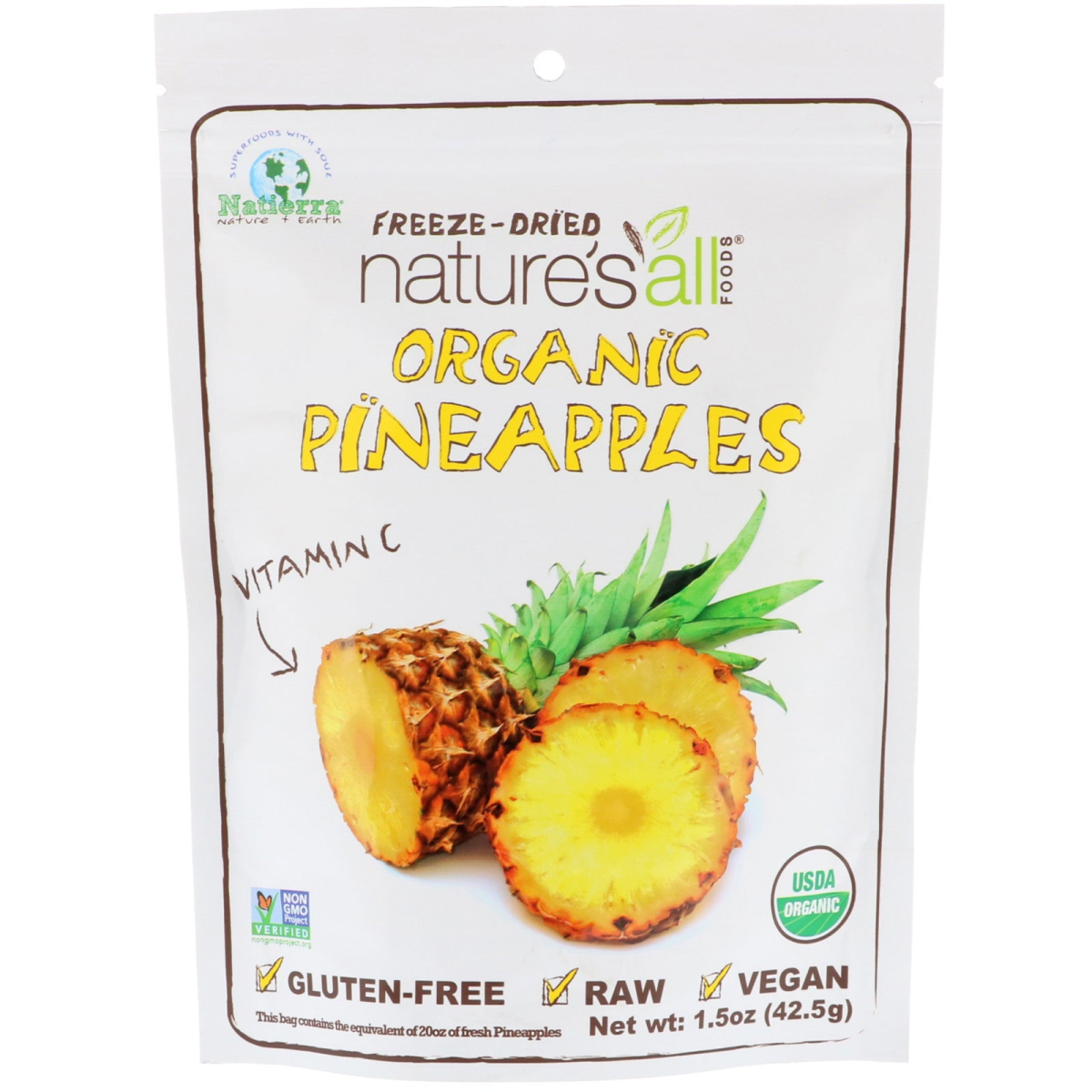 Superfood With Soul - Natierra Nature + Earth Vitamin C Non GMO Project Verified USDA Gluten Free Raw Vegan This Bag Contains the Equivalent of 20 oz Fresh Pineapples Certified by Global Culture Our Product Is: No Coloring / No Preservatives No Sugar Added This healthy and delicious snack is the latest treasure discovered by Terry for Natierra on his quest for quality in the spirit of adventure. He created meaningful partnerships with the people who are care for the fruit before it's presented to you as a sweet, crunchy, freeze-dried, anytime-snack. At home or on the go, Natierra's freeze-dried fruit are perfect as a: Cereal Topper Office Snack Lunchbox Treat