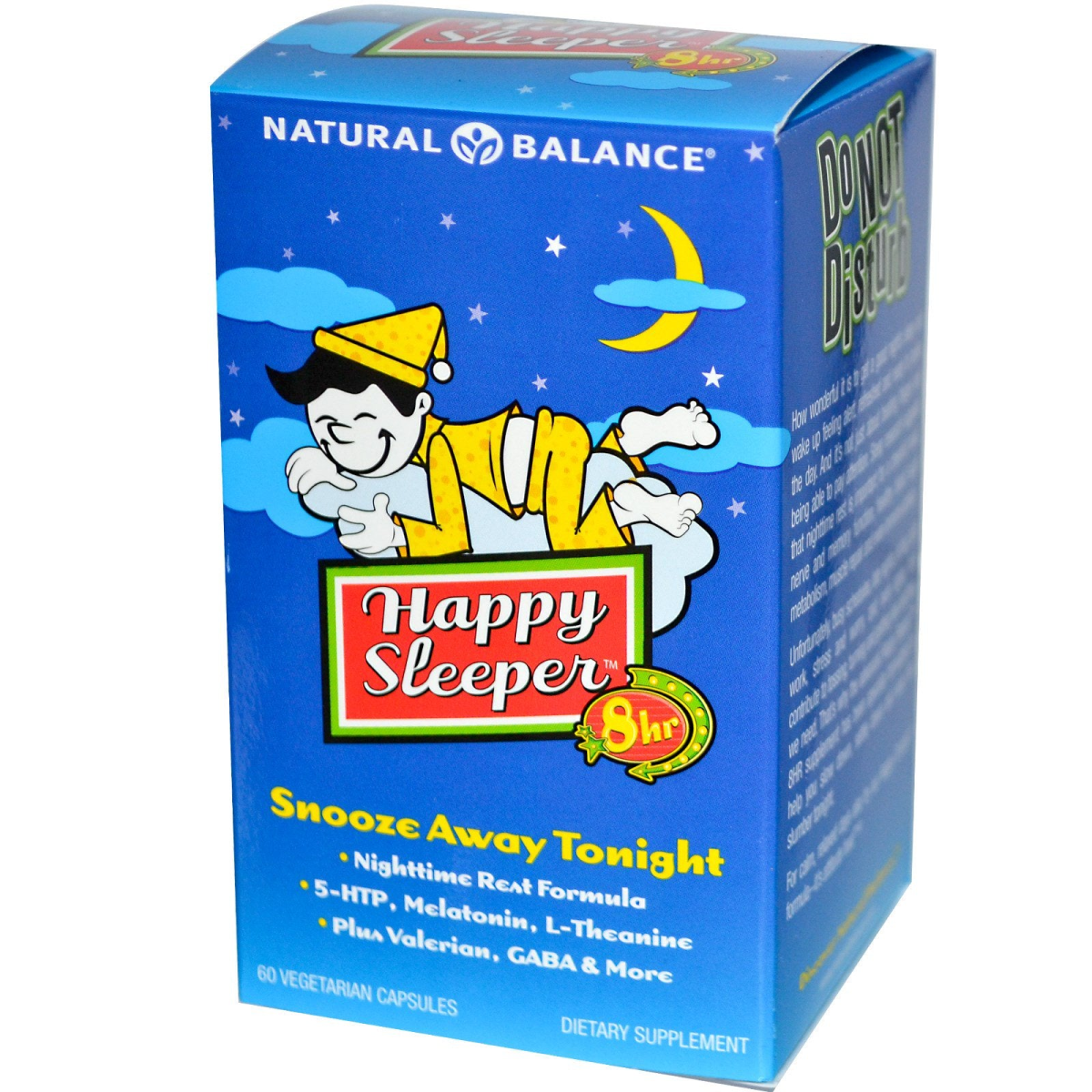 Snooze Away Tonight Nighttime Rest Formula 5-HTP, Melatonin, L-Theanine Plus Valerian, GABA & More Dietary Supplement Do Not Disturb How wonderful it is to get a good night's sleep and wake up feeling alert, refreshed and ready to tackle the day. It's not just about beating fatigue. Sleep research suggests that nighttime rest is important for a cheerful mood, nerve and memory function, healthy blood sugar metabolism, muscle repair and even immune activity. Unfortunately, busy schedules, late nights, jet lag, shift work, stress and worry, and even aging may contribute to tossing, turning and getting less rest than we need. That's why the advanced Happy Sleeper 8HR supplement has been specially formulated to help you slow down, settle down and ease into slumber tonight. For calm, relaxed days also try our Happy Camper formula—it's attitude food! The comprehensive Happy Sleeper 8HR blend is intended to provide nutritive support for restorative relaxation and peaceful rest. Its unique, balanced combination includes calming botanicals plus vitamins, aminos, 5-HTP, L-Theanine, GABA, Melatonin and more! 5-HTP — precursor to serotonin, the calming neurotransmitter Melatonin—the body's day/night regulator L-Theanine—amino acid found in green tea that may promote relaxing alpha waves in the brain GABA—amino acid that may act as an inhibitory neurotransmitter in the brain Glycine—an amino acid researchers believe has a role in keeping the body still during sleep Valerian—traditional herbal remedy known primarily for its sedative properties Passionflower, Lemon Balm & English Lavender—traditional herbs used for supporting healthy relaxation and digestive function.