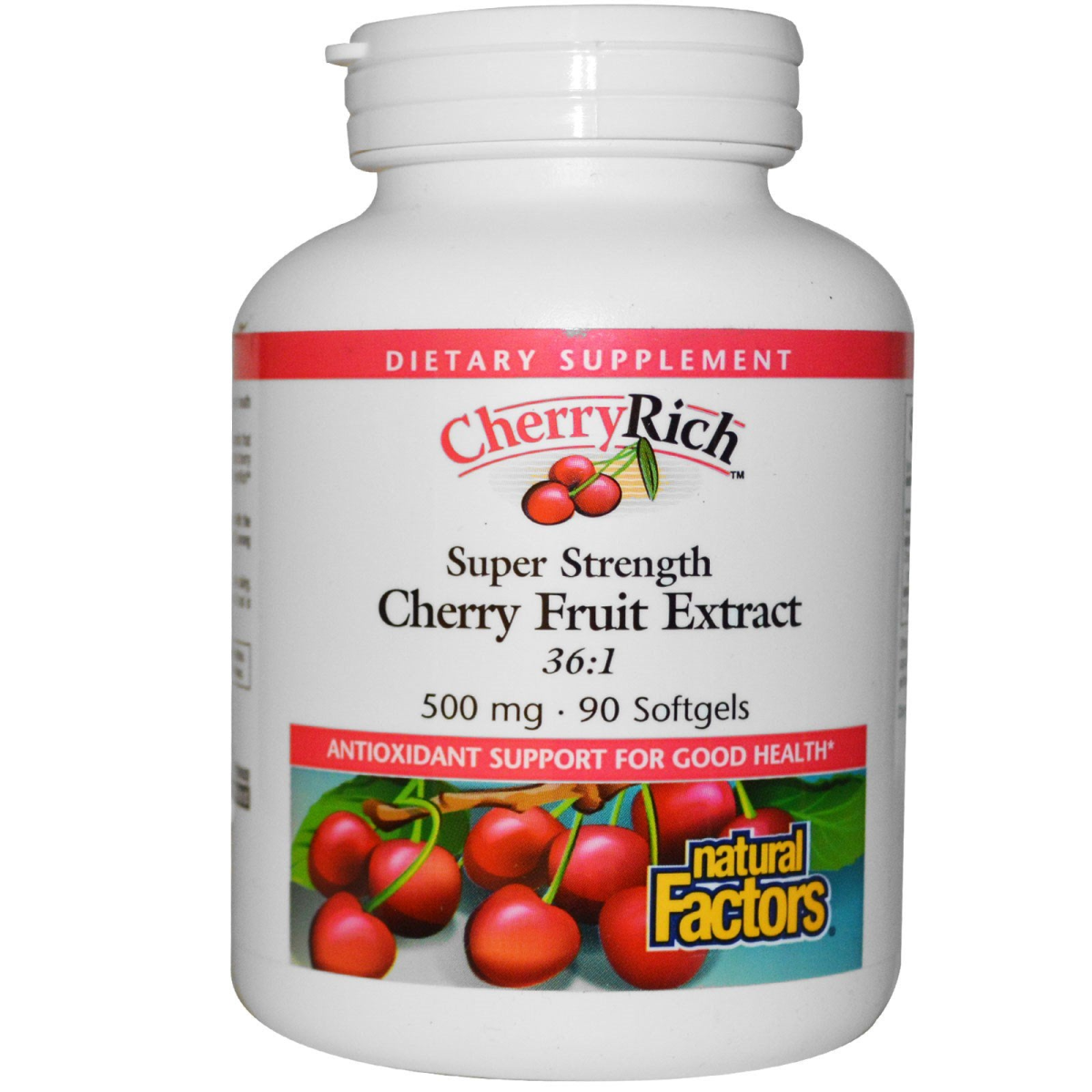 36:1 Antioxidant Support for Good Health Dietary Supplement Purity & Potency Guaranteed CherryRich is a highly concentrated extract rich in special compounds that provide antioxidant support for good health. Research has shown that cherry fruit may support joint structures and uric acid metabolism. CherryRich extract is made from 100% non-GMO fresh Bing cherries. All Natural Factors products are manufactured in accordance with the Government of Canada's Good Manufacturing Practices (GMP), among the highest standards in the world.