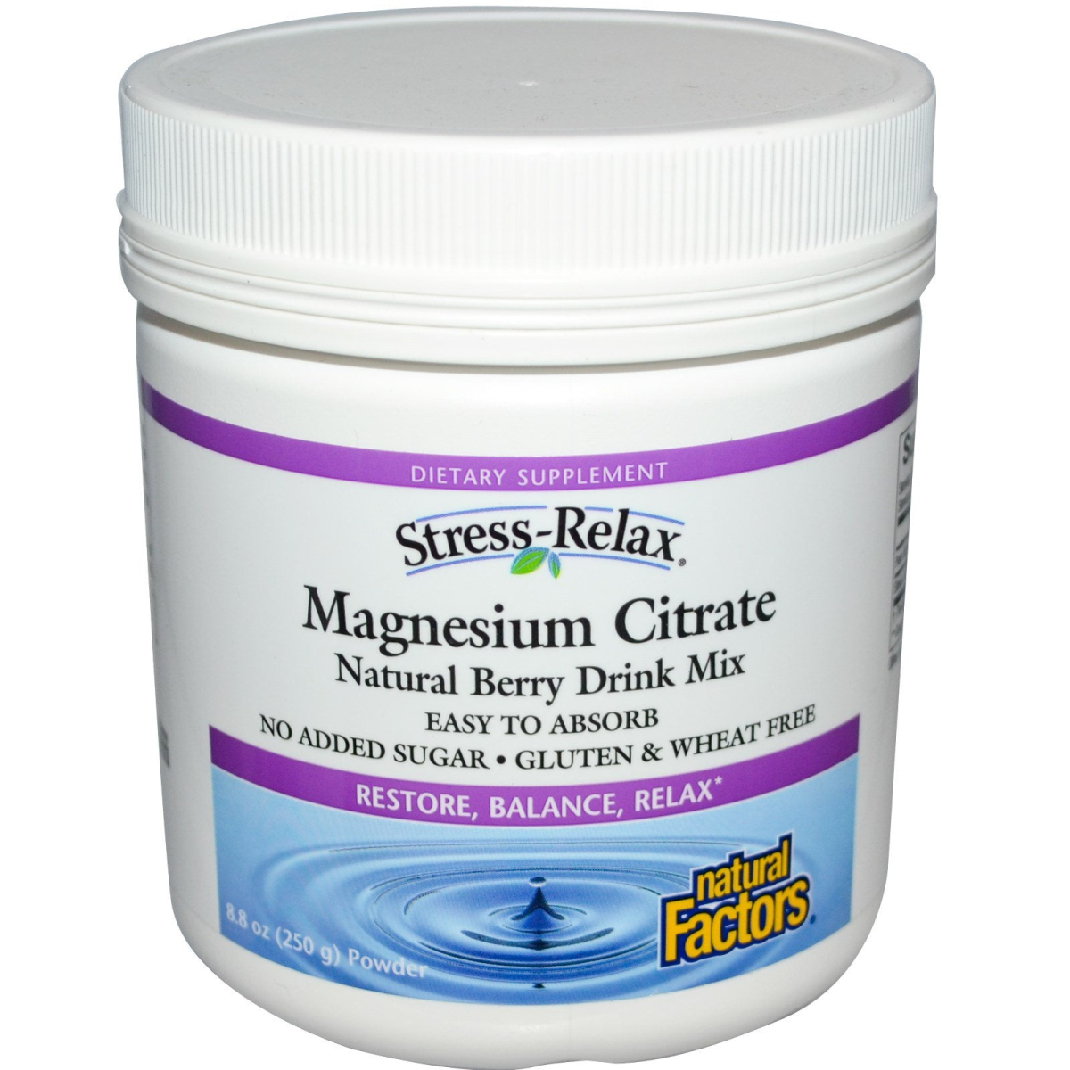 Dietary Supplement Easy to Absorb No Added Sugar Gluten & Wheat Free Restore, Balance, Relax Purity & Potency Guaranteed Stress-Relax Natural Berry Drink Mix is an easy-to-absorb source of magnesium that helps restore normal levels of magnesium and balance calcium intake. Magnesium is essential to the proper functioning of many of the body's systems such as helping to metabolize carbohydrates, fats and proteins, and maintenance of health bones and teeth. In addition, it supports proper muscle function, relieves stress and promotes overall relaxation and restful sleep. All Natural Factors products are manufactured in accordance with the Government of Canada's Good Manufacturing Practices (GMP), among the highest standards in the world.