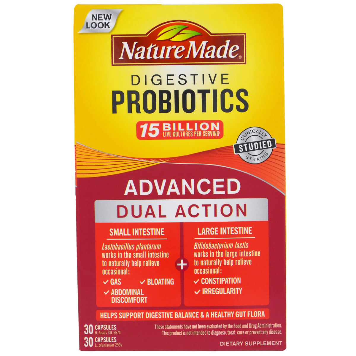15 Billion Live Cultures per Serving‡ Clinically Studied Strain Helps Support Digestive Balance & A Healthy Gut Flora Dietary Supplement No Dairy Gluten Free 100% Vegetarian Includes: 30 Capsules - B. lactis SD-5674 30 Capsules - L.plantarum 299v Small Intestine Large Intestine Lactobacillus plantarum works in the small intestine to naturally help relieve occasional: Bifidobacterium lactis works in a large intestine to naturally help relieve occasional: Gas Constipation Bloating Irregularity Abdominal Discomfort ‡Formulated to provide at least 5 billion live cells per capsule (Bifidobactertium lactis SD-5674) and 10 billion live cells per capsule (Lactobacillus plantarum 299v) if continuously store in a cool, dry place at or bellow 77ºF (25ºC) and consumed prior to expiration date. Why Take Advanced Dual Action Probiotics? Why take a probiotic that only targets one part of your digestive tract? Nature Made Advanced Dual Action Probiotic provides comprehensive coverage with two strains of probiotics that help support a healthy gut flora: 10 billion CFU of L. plantarum 299v helps relieve occasional gas, bloating and abdominal discomfort in the small intestine. 5 billion CFU of B. lactis SD-5674 helps relieve occasional constipation and irregularity in the large intestine. Why Nature Made Probiotics? Guaranteed potency until expiration Clinically efficacious dose Gently enough for everyday use A 40-year heritage brand