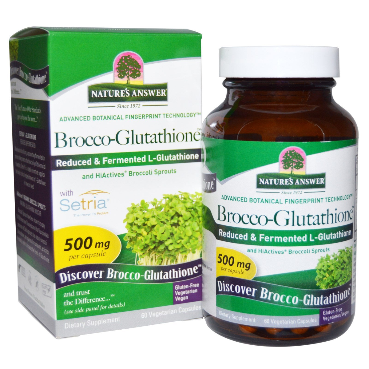 Since 1972 Advanced Botanical Fingerprint Technology Reduced & Fermented L-Glutathione and HiActives Broccoli Sprouts With Setria The Power to Protect 500 mg Per Capsule Discover Brocco-Glutathione and Trust the Difference Dietary Supplement Gluten-Free Vegetarian Vegan Holistically Balanced Cruelty Free Human Clinically Tested Setria L-Glutathione Brocco-Glutathione with Setria Glutathione The True Nature of Our Standards go way beyond the norm... Setria L-Glutathione Reduced & Fermented Manufactured utilizing a proprietary fermentation process that protects the bioactivity of this crucial tripeptide, Setria is a stable form the supplies the body's critical replenishment of L-Glutathione in times of need. HiActives Organic Broccoli Sprouts Natural Glutathione Booster Broccoli Sprouts have been shown to supply 10-100 times more Glucoraphanin (the Glucosinolate precursor of Sulforaphane) than mature broccoli. Sulforaphane, an organosulfur compound, activates the body's cells to increase the levels of Glutathione.