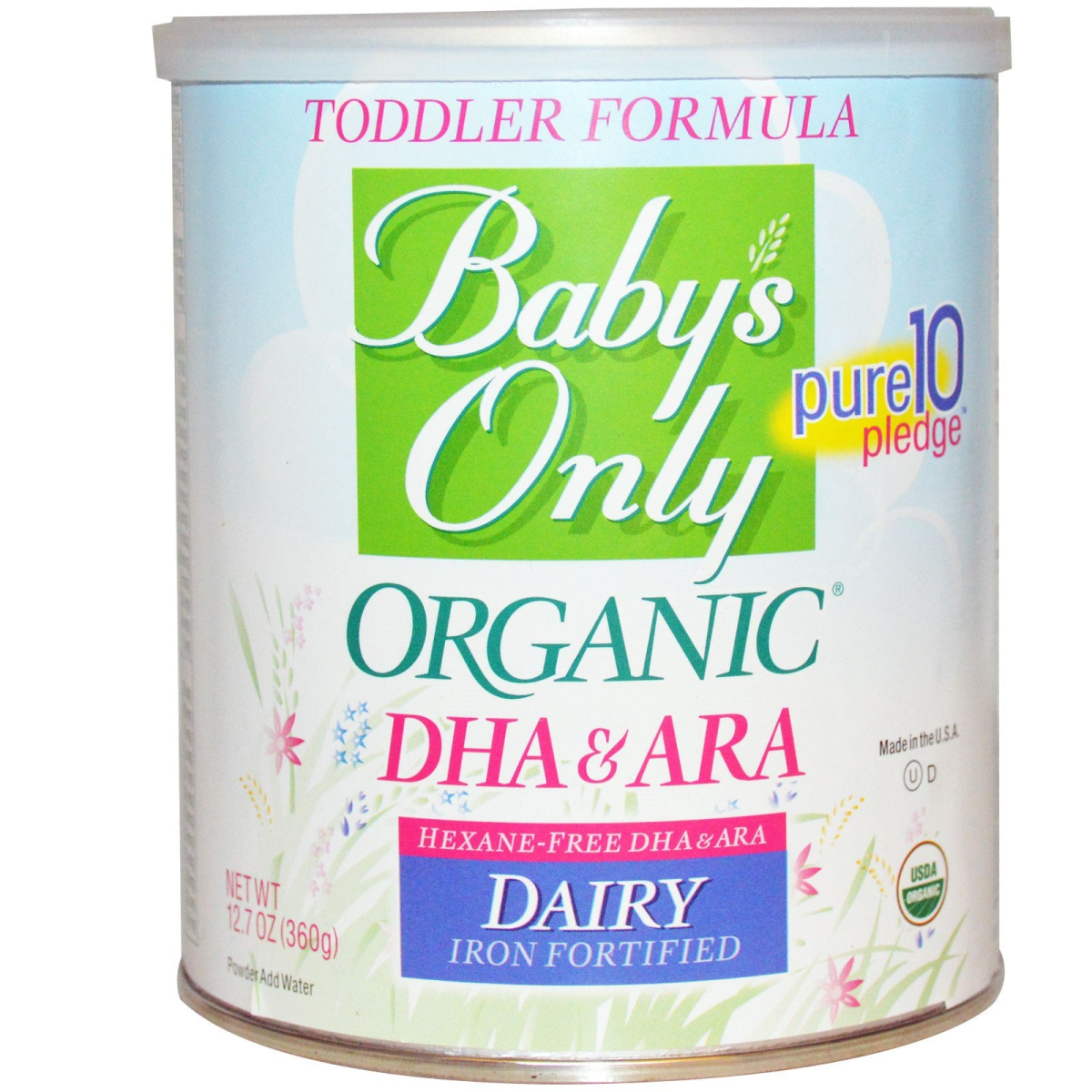 Pure10 Pledge Hexane-Free DHA & ARA USDA Organic Powder Add Water Certified Organic by OneCert We Make Organic Better Now using organic-compliant technology to help eliminate environmental toxins Breast milk contains rich sources of DHA & ARA from phospholipids. Baby's Only Organic now contains DHA & ARA lipids naturally derived from egg phospholipids, achieving a more natural fatty acid profile. All other organic and conventional infant formulas use algae & fungus oils that are treated with hexane solvent, acid and bleach. Nature's One recognizes that breast milk is the best source of nutrition a mother can provide her baby. Therefore, Baby's Only Organic is not intended for infants under 1-year of age unless specified by a healthcare professional.