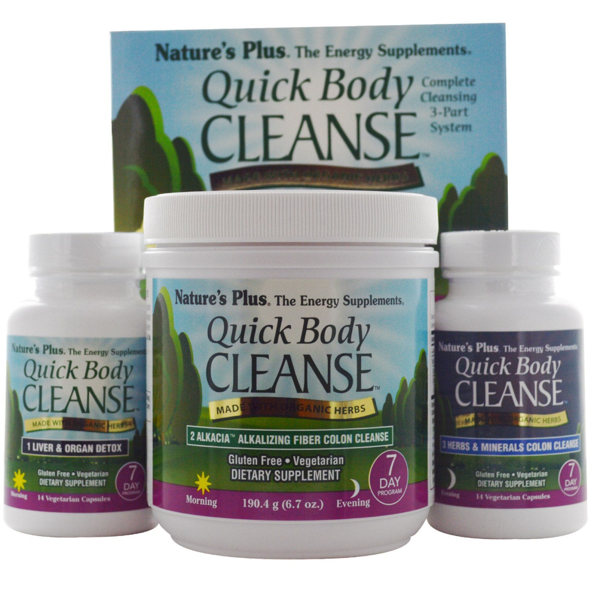 The Energy Supplements Complete Cleansing 3-Part System Made with Organic Herbs Gluten Free Vegetarian Dietary Supplement Certified Organic by OneCert Manufactured in an NSF GMP Certified Facility Contains Liver & Organ Quick Detox - 14 Capsules Alkacia Alkalizing Fiber Quick Colon Cleanse - 190.4 g (6.7 oz) Herbs & Minerals Quick Colon Cleanse - 14 Capsules Total Body Rejuvenating Cleanse! The finest herbal internal cleansing products from Nature's Plus The Name Your Trust! Nature's Plus Quick Body Cleanse, made with only organic herbs, is a 3-part, 7-day internal cleansing program designed to recharge your life with the power of revitalizing cleansing energy. In easy-to-swallow vegetarian capsules, the Liver & Organ Quick Detox formula (morning) supplies herbs, amino acids and antioxidant nutrients. The Alkacia Alkalizing Fiber Quick Colon Cleanse, featuring acacia, is a morning and evening formula, while the evening Herbs & Mineral Quick Colon Cleanse provides magnesium hydroxide, rhubarb and soothing herbs. Detoxify 1 Liver & Organ Quick Detox Sequester 2 Alkacia Alkalizing Fiber Quick Colon Cleanse Eliminate 3 Herbs & Minerals Quick Colon Cleanse Experience whole-life-enhancing energy as gentle, yet powerful herbs remove accumulated waste and toxins throughout the body and support optimal function of the digestive tract—the 9 Vital Factors of Healthy Elimination. The 9 Vital Factors of Healthy Elimination 1 Stomach: marshmallow root, L-glutamine, L-glycine 2 Small Intestine: dandelion, turmeric 3 Large Intestine: acacia fiber, rhubarb 4 Neuromuscular Control: Movement (peristalsis): dandelion, triphala, Algas calcareas Containment (cardiac sphincter and pyloric sphincter control): apple, grape seed extract 5 Liver: L-glycine, L-glutamine, L-methionine, L-cysteine, milk thistle, turmeric root, dandelion root, fenugreek seed garlic bulb 6 Lungs: garlic, fenugreek, oregano 7 Lymphatic System: garlic, oregano 8 Kidneys: dandelion leaf, nettle leaf 9 Blood: amla, milk thistle, garlic, grape seed Made with only organic herbs, the Nature's Plus line of herbal internal cleansing products includes a variety of programs and formulations for everyone: Fresh Start Cleanse, a two-week, morning and evening program for individuals new to cleansing who wish to promote daily bowel regularity Complete Body Cleanse, a 14-day program for those who wish to promote daily bowel regularity, which includes an Herbal Detox formula and two colon cleansing formulas Quick Body Cleanse, a 7-day program for experienced cleansers Experience the revitalizing energy that can only come from powerful cleansing supplements made with organic ingredients to address the 9 Vital Factors of Healthy Elimination.