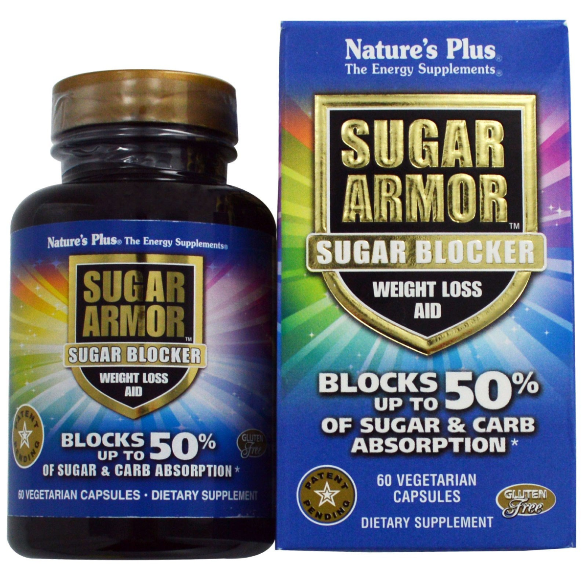 The Energy Supplements Blocks up to 50% of Sugar & Carb Absorption Patent Pending Gluten Free Dietary Supplement Nutritional Support for Healthy Sugar Control & Weight Management Vegetarian Sugars and starches in the diet require enzyme activity in order to be absorbed. Patent Pending Nature's Plus Sugar Armor shuts down over 95% of that enzymatic activity, reducing your carb concerns by up to 50%! Blocking up to 50% of the sugar and starch absorption in each meal will shift your weight loss efforts into overdrive, delivering amazing results. The secret to Nature's Plus Sugar Armor is in its patent pending dual action shielding system. 500 mg of InnuGuard inulin fiber from chicory surrounds the sugars and starches you eat, making them more difficult to digest and absorb. Meanwhile, 250 mg of sugar-blocking brown seaweed extract blocks over 95% of sugar and starch digestion, further limiting the impact of these health-robbing carbs. Nature's Plus Sugar Armor, and a sensible approach to sugary and starchy foods, will change your approach from a weight loss effort to effortless weight loss!