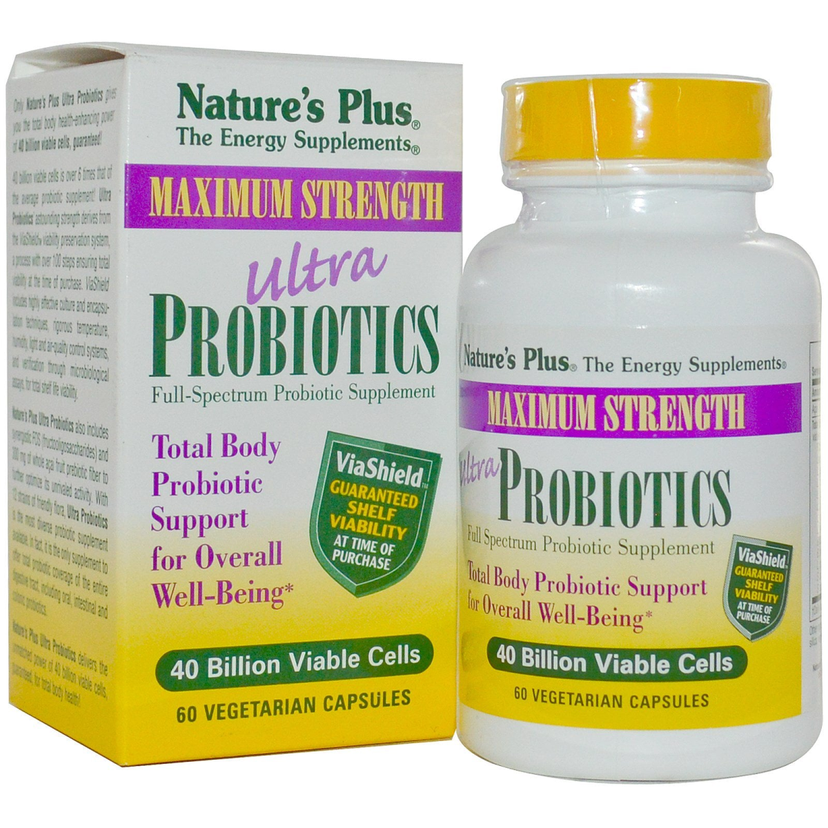 The Energy Supplement Maximum Strength Full-Spectrum Probiotic Supplement Total Body Probiotic Support for Overall Well-Being ViaShield Guaranteed Shelf Viability At Time of Purchase Nutritionally Supports Healthy Digestive Function and Overall Well-Being. Gluten Free Only Nature's Plus Ultra Probiotics gives you the total body health-enhancing power of 40 billion viable cells, guaranteed! 40 billion viable cells is over 6 times that of the average probiotic supplement! Ultra Probiotics' astounding strength derives from the ViaShield viability preservation system, a process with over 100 steps ensuring total viability at the time of purchase. ViaShield includes highly effective culture and encapsulation techniques, rigorous temperature, humidity, light and air-quality control systems, and verification through microbiological assays, for total shelf life viability. Nature's Plus Ultra Probiotics also includes synergistic FOS (fructooligosaccharides) and 300 mg of whole acai fruit prebiotic fiber to further optimize its unrivaled activity. With 12 strains of friendly flora, Ultra Probiotics is the most diverse probiotic supplement available. In fact, it is the only supplement to offer total probiotic coverage of the entire digestive tract, including oral, intestinal and colonic probiotics. Nature's Plus Ultra Probiotics delivers the unmatched power of 40 billion viable cells, guaranteed, for total body health!