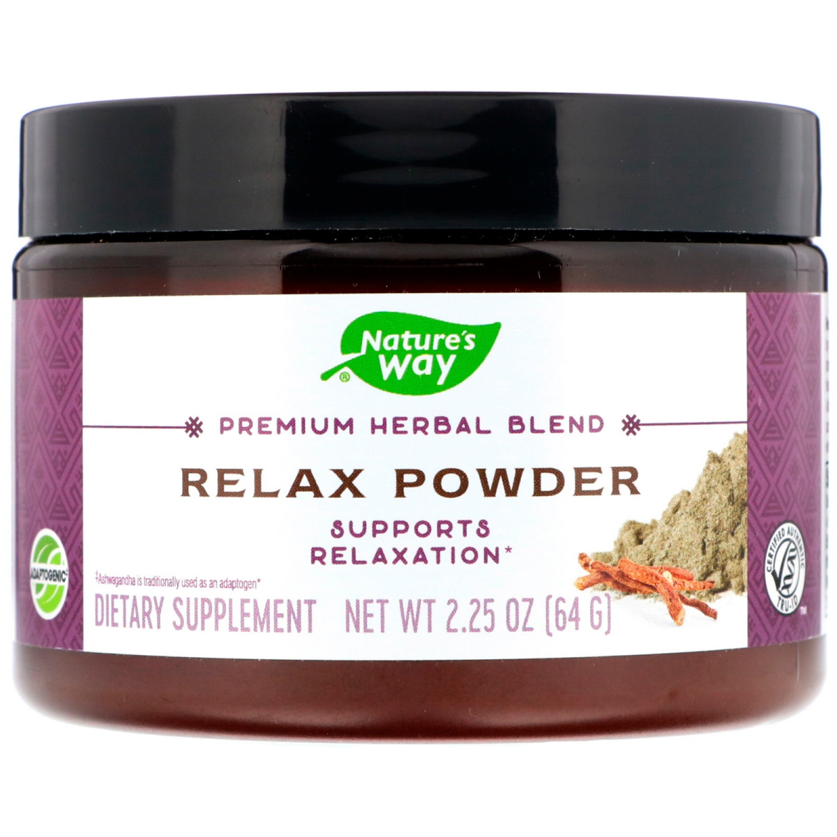 Supports Relaxation Adaptogenic‡ Dietary Supplement Certified Authentic Tru-ID Helps Promote Relaxation Gluten Free BPA Free Vegan A blended herbal powder harnessing the relaxing benefits of L-Theanine to help reduce stress. ‡Ashwagandha is traditionally used as an adaptogen.
