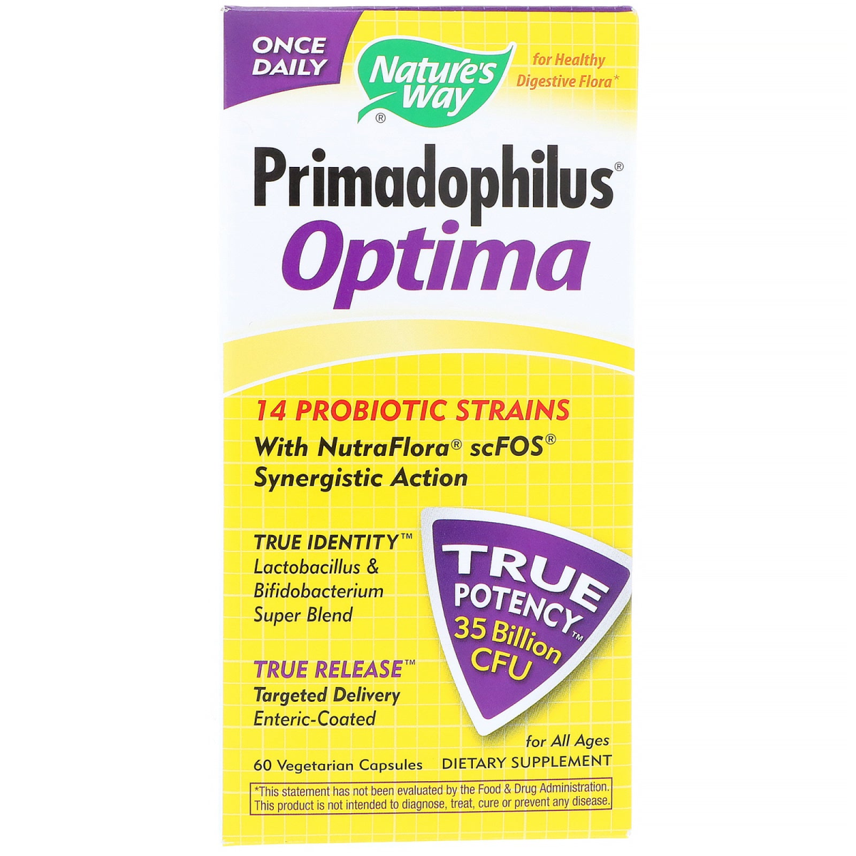 Synergistic Probiotic -More Strains than Other Brands Once Daily For Healthy Digestive Flora 14 Probiotic Strains With NutraFlora scFOS Synergistic Action True Identity- Lactobacillus & Bifidobacterium Super Blend True Release- Targeted Delivery Enteric-Coated True Potency 35 Billion CFU Dietary Supplement True Guarantee Probiotic Enhanced with NutraFlora Exclusively backed by True Guarantee True Potency ensures 35 billion CFUs per capsule for the entire shelf life True Identity ensures only the strains listed on the label are found in the product True Release enteric-coating ensures stomach acid survival and intestinal delivery Unique Advantages of Primadophilus Optima Offers a diverse and unique probiotic and prebiotic combination 35 billion CFUs (colony forming units) per capsule of 14 synergistic strains Designed to meet the needs of all ages With NutraFlora scFOS Suitable for vegetarians Replenish Microflora with Primadophilus Optima Primadophilus Optima is a potent (35 billion CFUs) and diverse (14 strains) formula of probiotics for intestinal microflora. Why 14 Probiotic Strains? Like a fingerprint, each individual has a unique balance of strains in their microflora Primadophilus Optima provides a broad diversity of strains commonly found in the human digestive tract Each strain provides its own unique benefits With NutraFlora scFOS Unique "short-chain" form of FOS Preferred food source for microflora Promotes microflora growth & colonization More effective than other FOS forms Importance of Microflora The "friendly" bacteria of the intestinal tract are essential to good health because they: Secrete enzymes to aid proper digestion Produce organic compounds that inhibit the reproduction of harmful bacteria Boost immune function Stress, poor diet, age and changes in lifestyle can adversely affect microflora.