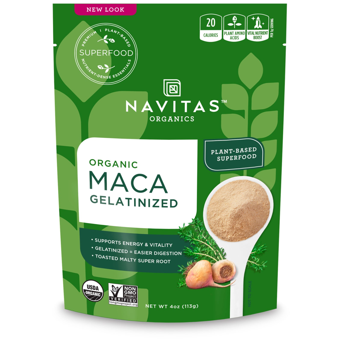 Premium Plant-Based Superfood Nutrient-Dense Essentials 20 Calories / Plant Amino Acids / Vital Nutrient Boost - Per 5 g Serving Supports Energy & Vitality Gelatinized = Easier Digestion Toasted Malty Super Root USDA Non-GMO Project Verified Ancient Treasure B Corporation Certified Kosher Gluten-Free Vegan Certified By Control Union Certifications BPA Free Positive Mind - Positive Vibes - Positive Life Superfood Promise: Using the most health-boosting plants in the world, we promise our superfoods are , nutrient dense & handled with care at every step. Maca: Inca Warriors Used For Endurance Adaptogen: Combats Stress & Fatigue Gelatinization: Removes Starch For Easier Digestion Go after each day with passion and drive. Super-simple, super-nutritious superfoods give you the energy you need to live each day to the fullest. In fact, Navitas (Nuh-vee-tus) is Latin for 'energy'. We search the globe for the highest-quality superfoods to keep you energized. What's more, we work hard to power the positive in all we do as a company, celebrating healthy foods and supporting sustainable causes. Navitas. Live Life Positive.