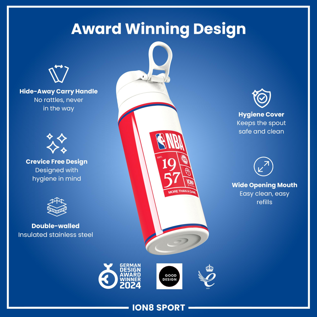 Raise your game with the Official NBA Thermal Insulated Bottle by ION8. Designed to meet the uncompromising standards of NBA, this 750ml double-wall stainless steel bottle combines premium performance with unmistakable NBA pride.