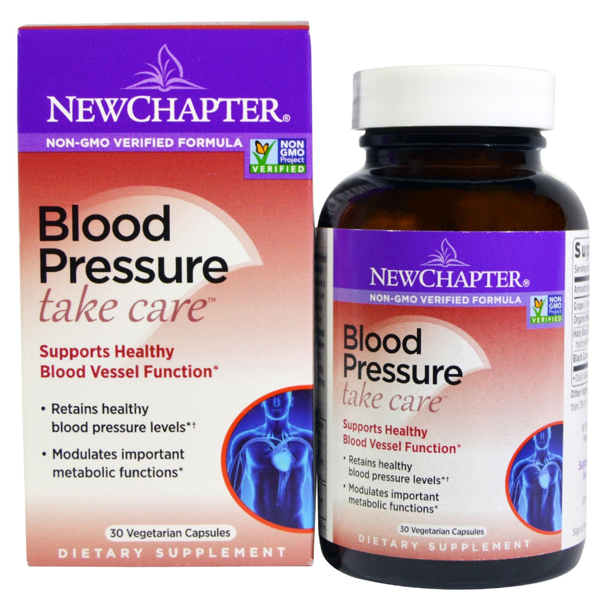 Non-GMO Verified Formula Non GMO Project Verified Supports Healthy Blood Vessel Function Retains Healthy Blood Pressure Levels†Modulates Important Metabolic Functions Dietary Supplement Naturally Gluten Free Holistic New Chapter Take Care formulas target specific areas of wellness and provide combinations of whole-food cultured vitamins, minerals, herbs and superfoods to health and wellness. Focus on Your Blood Pressure Blood Pressure Take Care delivers targeted herbal extracts for cardiovascular support. The patent-pending Grape Seed extract in Blood Pressure Take Care has been shown to support healthy blood pressure levels in adults. The formula’s select targeted herbs also help maintain these healthy levels. The Full-Spectrum Difference Many companies isolate elements from an herb and label it “whole herb.â€