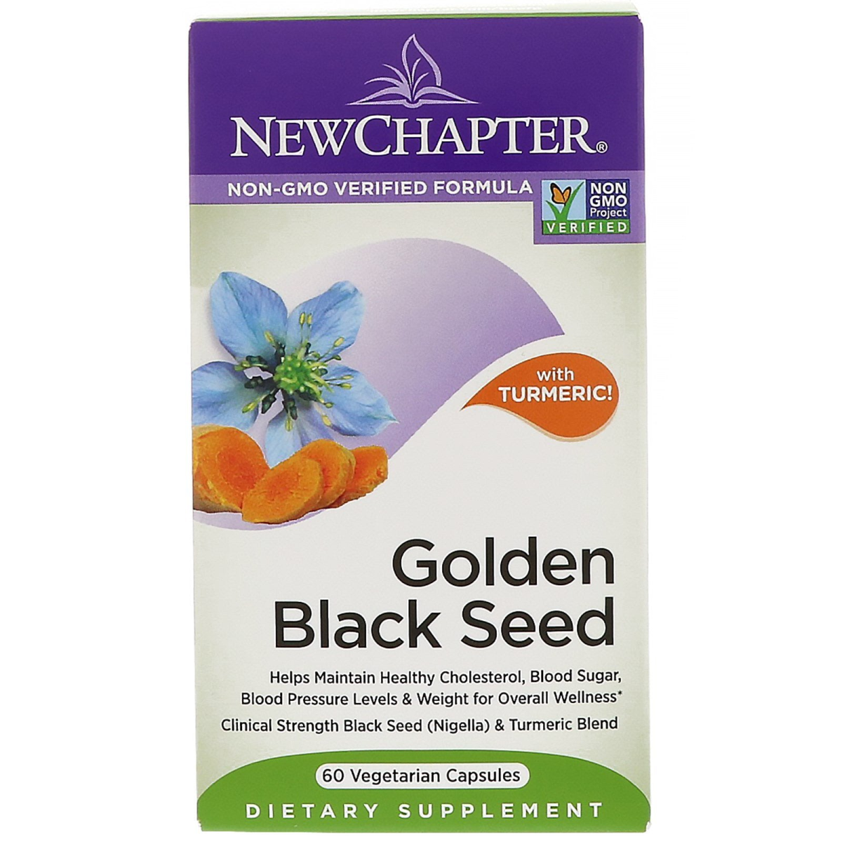 Non-GMO Verified Formula Non GMO Project Verified With Turmeric! Clinical Strength Black Seed (Nigella) & Turmeric Blend Dietary Supplement Gluten Free; 100% Vegetarian; No Artificial Flavors or Colors Certified B Corporation New Chapter's Guiding Principles To deliver the Wisdom of Nature thus relieving suffering and promoting optimal health. To advance the organic mission, nourishing body and soul with healing intelligence of pure whole foods or herbal supplements. To nurture and sustain Mother Earth, the source of natural healing. To honor and reward personal growth, for enlightened teamwork depends on the vitality of every member of the New Chapter family. Certified B Corporation New Chapter is proud to be a Certified B Corp, using business as a force for good. Helps maintain healthy cholesterol, blood sugar, blood pressure levels & weight for overall wellness. Discover the Gold Black Seed Difference Wellness with Nature's Wisdom Metabolic syndrome is a cluster of risk factors that can impact healthy aging and longevity. Experience the first herbal formula with clinically studied Black Seed & Turmeric address all 4 health goals for people at risk for metabolic syndrome. Golden Black Seed supports: Normal cholesterol levels Healthy blood sugar lavels Healthy weight Normal blood pressure 5 Signs of Inner Health Our science proves that Gold Black Seed works on the cellular level† to activate the 5 signs of inner health. Builds Up Antioxidant Lvels Traps Free Radicals Balances Inflammation Enhances Cell Recovery Supports Healthy Aging Herbal. Holistic. Health. Metabolic Syndrome Support Delivers a clinically studied Black Seed & Turmeric blend that supports 4 critical health goals for people at risk for metabolic syndrome: helping to maintain healthy cholesterol levels, blood sugar levels, body weight, and blood pressure. Memory & Cognition Sustained use of Black Seed has been shown to support memory, healthy attention span, and overall cognition. Turmeric also supports working memory. Calming Stress Support Black Seed has been clinically shown to support healthy mood and alterness, and decrease occasional anxiety and stress. Powerful Herbal Synergy Together, Black Seed and Turmeric work significantly better than taking each herb on it own (as shown in clinical testing). Full-Spectrum Potent Extracts One capsule is made from 1,085 mg of Black Seed & 1,807.5 mg of Turmeric Rhizome †As shown in preclinical lab testing