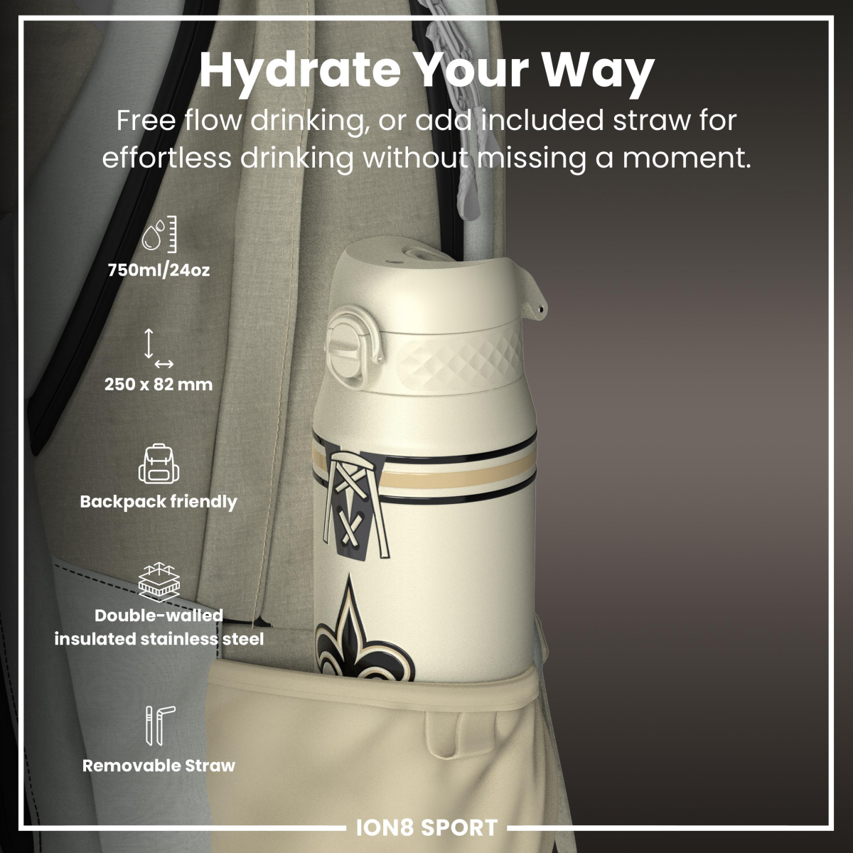 NFL x ION8 Insulated Steel Water Bottle, NFL Saints, 750ml (24oz)