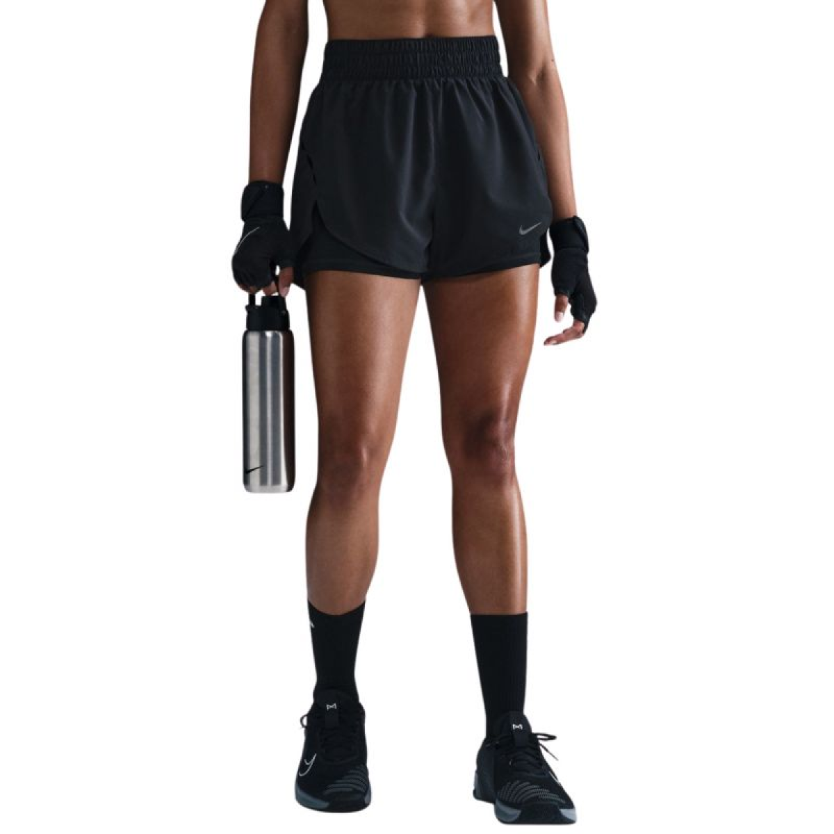 Nike One Dri-Fit HR 2in1 Women's Shorts, Black HV0576 010. These Nike women's shorts are perfect for training. They feature a standard fit and an elastic waistband. Dri-FIT technology wicks away excess moisture. Side pocket. Quick-drying fabric. Reflective logo. Material: 100% polyester.