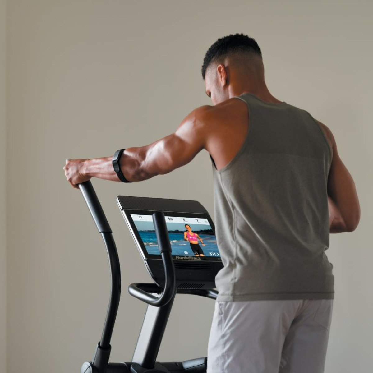 - The AirGlide 14i programmable elliptical trainer by NordicTrack is a solid, durable and multifunctional device with a flywheel at the front, designed for intensive training at home.