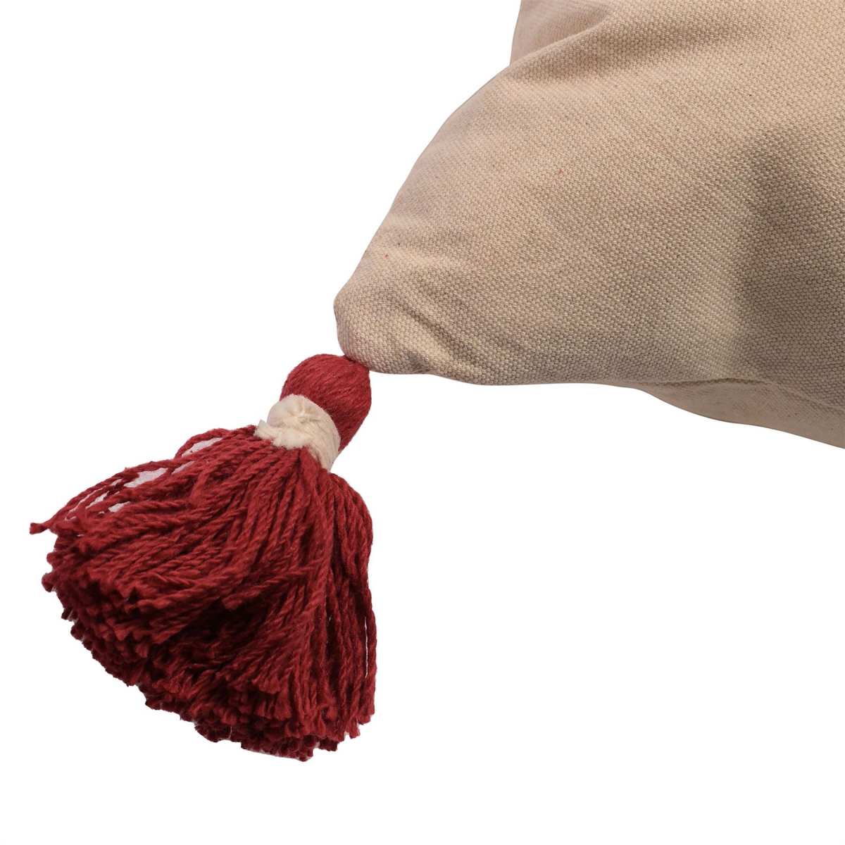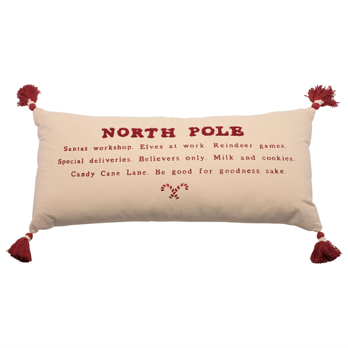 The rectangular, fabric cushion showcases beige colouring to both sides, complete with red embroidered �North Pole� title, printed festive references and matching candy cane design. It is finished by red woollen tassels on each corner.