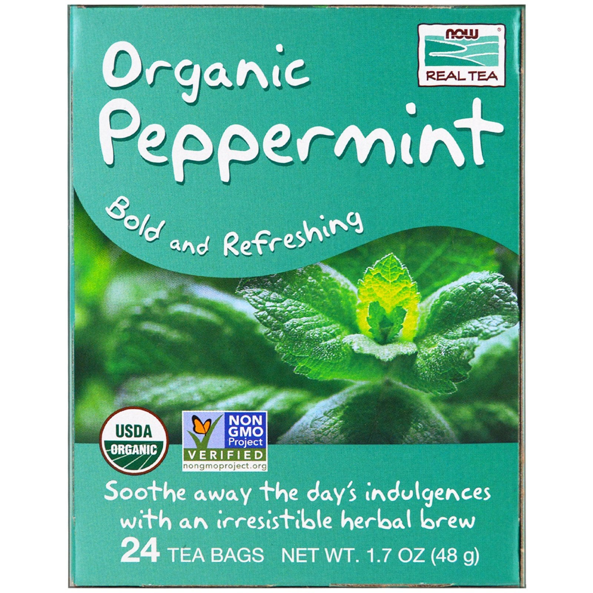 Bold and Refreshing USDA Non-GMO Project Verified Soothe Away the Day's Indulgences with an Irresistible Herbal Brew Brew It Natural. Sip It Real. Certified by QAI When it comes to refreshing flavors, is there anything better than peppermint? We think not. Its bold flavor and natural oils from the peppermint leaf create a beneficial beverage that can help you settle down from the day's indulgences. Best of all, you'll be completely kissable after just one sip! Premium unbleached tea bags with our no-staples design. We source only the highest quality ingredients so you can enjoy the most delicious, healthful tea everyday. Because you are what you eat and drink, NOW Real Food and Real Tea have been committed to providing delicious, healthy, natural products since 1968. We're independent, family owned, and proud of it. Keep it natural. Keep it real.