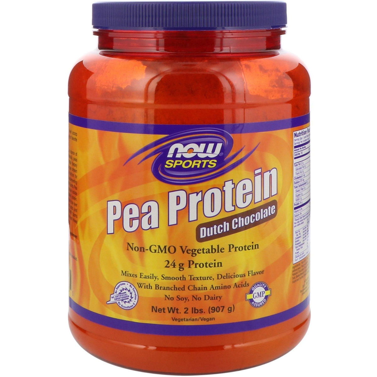 Non-GMO Vegetable Protein 24 g Protein Mixes Easily, Smooth Texture, Delicious Flavor With Branched Chain Amino Acids No Soy, No Dairy No Artificial Sweeteners - No Aspartame - No Sucralose -No Acesulfame-K Vegetarian/Vegan GMP Quality Assured Peas are well known for being a source of highly bioavailable protein. Additionally, peas are not considered one of the major allergens. Collectively, this makes pea protein an ideal source of post-workout nutrition for athletes who may have difficulty supplementing with other types of protein. NOW Sports Pea Protein is a Non-GMO vegetable protein isolate that has 24 grams of easily-digested protein. Each 1 scoop (44 g) serving typically has over 4,200 mg of branched chain amino acids, and over 2,000 mg of L-Arginine. NOW Sports Pea Protein has a smooth texture and mixes easily into water or other beverages.