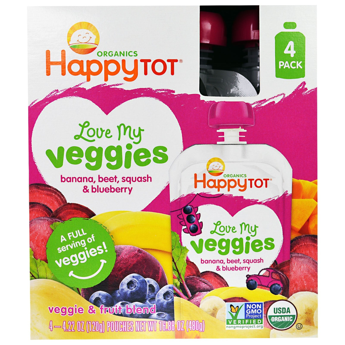 USDA Organic 4 Pack A Full Serving of Veggies Veggie & Fruit Blend Non GMO Project Verified Certified B Corporation Certified Organic by CCOF 1 Serving Vegetables is 1/4 Cup Our Enlightened Nutrition Philosophy Make every bite count with the right nutrition for a bright future Love My Veggies - A full serving of veggies in every pouch Nourish - Excellent source of Vitamins A & C Explore Flavor - Wholesome snack inspire a love of veggies Our Happy Promise Certified USDA Organic Non-GMO Project verified Packaging made without BPA We are real moms, pediatricians, and nutritionists on a mission to bring happiness and health to our little ones. We create nutritious meals and snacks that make eating enlightened, effortless, and delicious. From our Happy Family to yours! Why Happy Tot! Always organic Optimally formulated Easy, portable packaging made without the use of BPA About Happy Tot Love My Veggies Our Love My Veggies pouches contain a full serving of organic, nutritious veggies like beets and squash. With these wholesome snacks, your toddler is sure to become a veggie lover in no time!