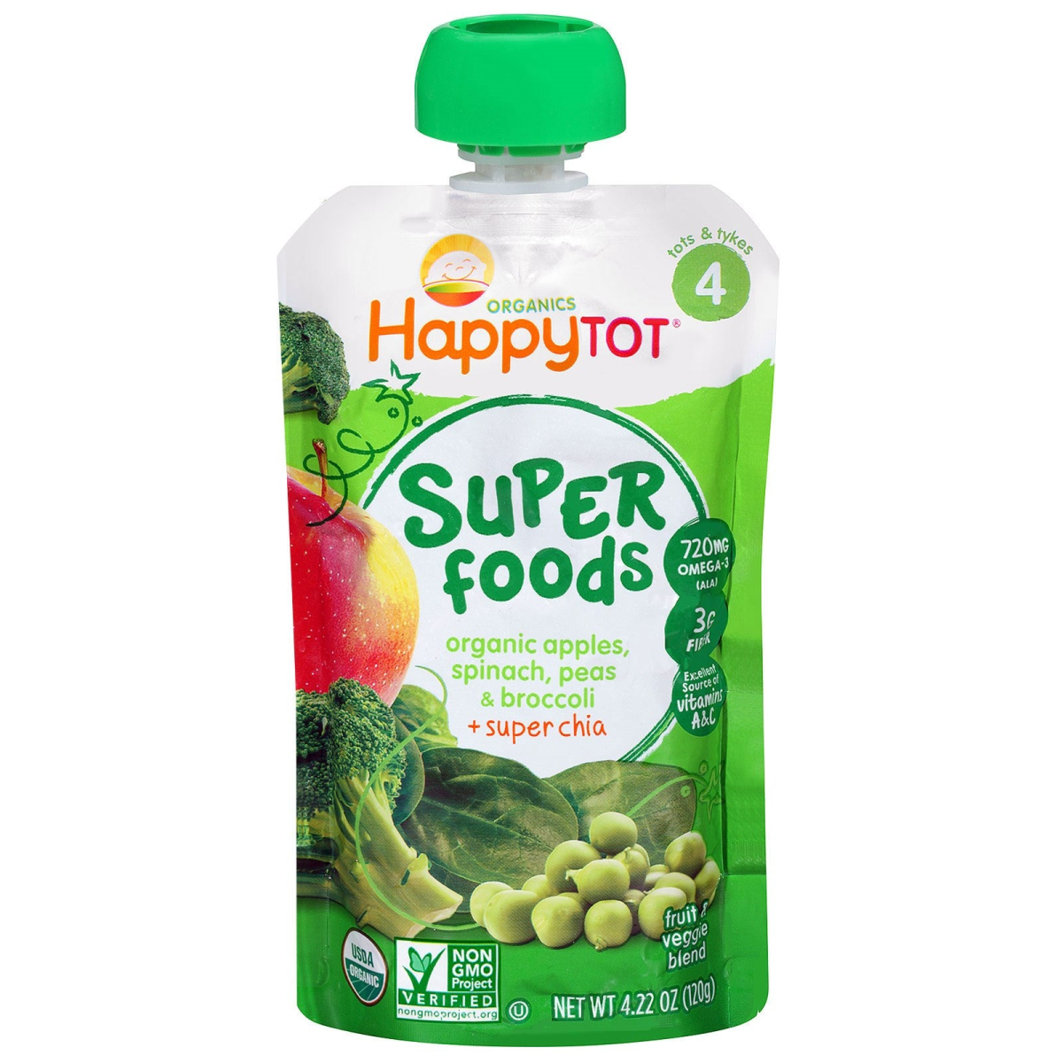 Nurture Inc. (Happy Baby) Happytot Superfoods Apples Spinach Peas & Broccoli + Super Chia 4.22 oz (120 g)
