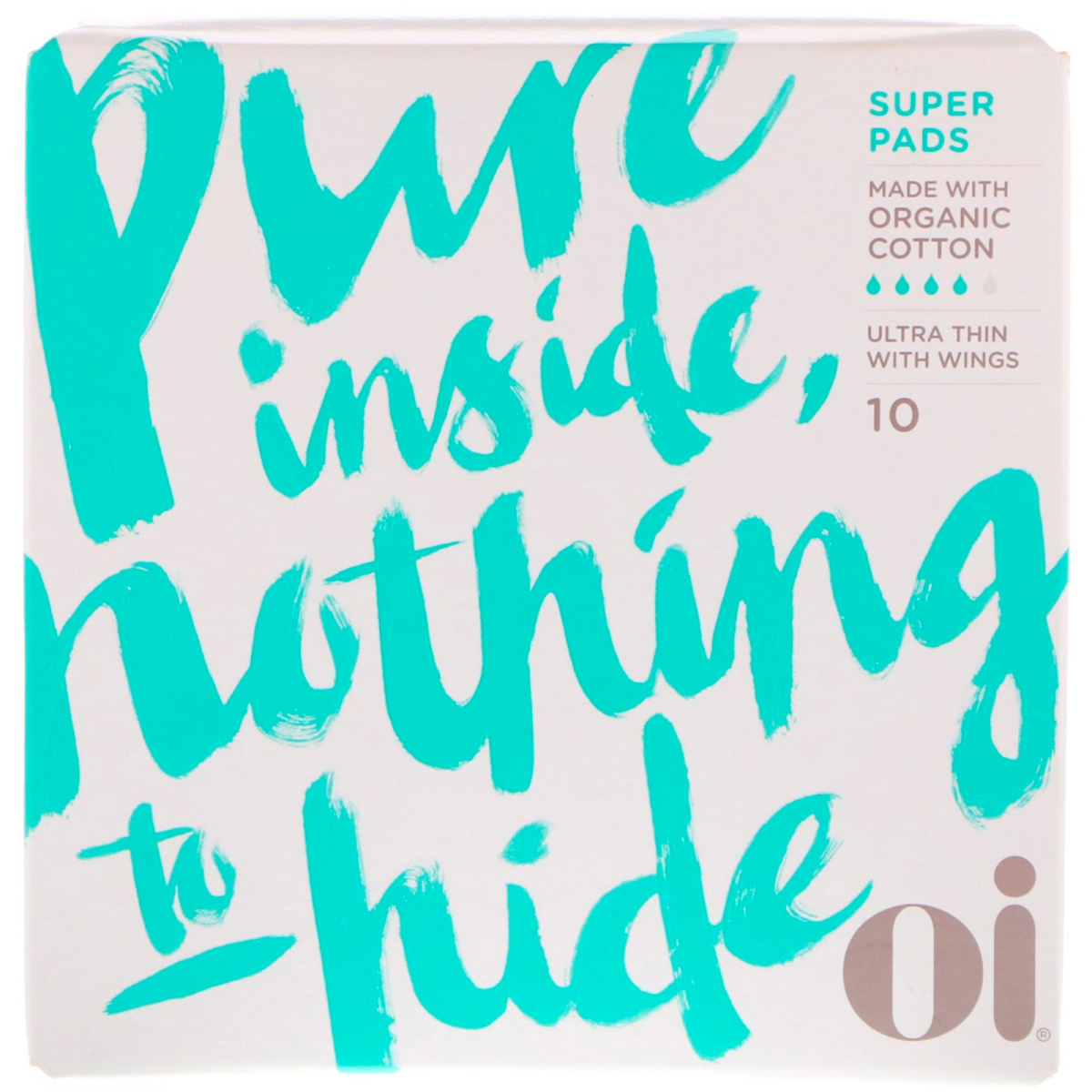 Pure Inside, Nothing to Hide Made with Cotton Certified Certified by ICEA-Ethical and Environmental Certified Institute Global Textile Standard Oi believes you deserve pure inside. Our certified cotton tampons, pads and panty liners are naturally absorbent, non-irritant and biodegradable to provide comfort and protection you can trust. Proudly made without synthetics and chemicals. Package contains: 10 Ultra Thin Super Pads with Wings Individually wrapped