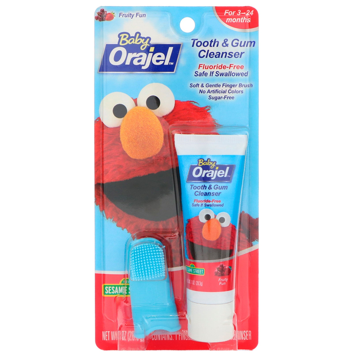 For 3-24 Months Fluoride-Free Safe if Swallowed Soft & Gentle Finger Brush No Artificial Colors Sugar-Free Contains: 1 Finger Brush, 1 Tooth Cleanser Pediatricians and pediatric dentists highly recommend that parents begin cleaning baby's teeth and gums everyday at an early age. Baby Orajel Tooth & Gum Cleanser can help your baby get a great start to a lifetime of beautiful smiles. Sugars in baby formula, juice and other foods can build up a plaque-like film. Cleaning the teeth and gums at an early age helps develop healthy habits. Baby Orajel Tooth & Gum Cleanser gently cleans teeth and gums with a mild, fruity flavor your baby will enjoy, plus the non-abrasive formula is gluten-free, paraben-free, dairy-free, and sodium lauryl sulfate-free for gentle cleaning. Also, it's fluoride-free so it's safe if swallowed when used as directed. Helps remove plaque for cleaner teeth along with brushing.