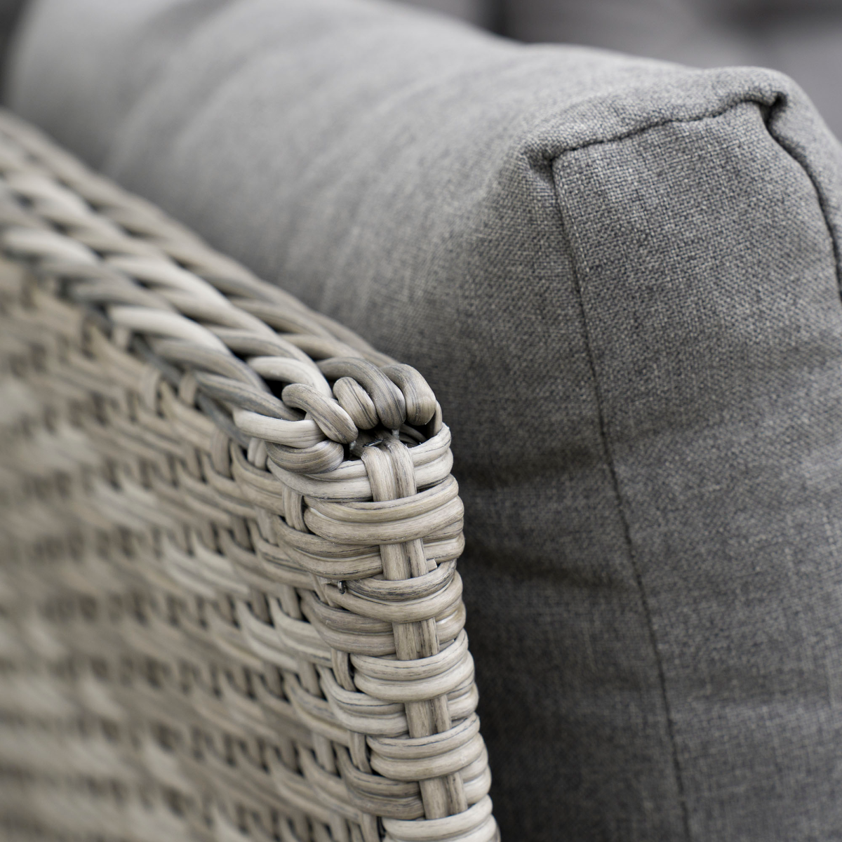 Six-piece rattan garden furniture set: Comes with includes a corner chair, right-handed loveseat, left-handed loveseat, long footstool, square footstool and a liftable coffee table.Lifting-top dining table: Dine around this garden sofa set at a level you want. Wood-effect top is beautiful - made from durable plastic.Cushions included: Sink in and keep comfortable on this grey rattan sofa set. Seat covers are removable and washable.Steel, wrapped in rattan: Each piece in this garden corner sofa set is strong, with the plastic wicker for a stylish look. Resistant to UV and light water damage.Dimensions: Chair: 70W x 70D x 84Hcm. Right loveseat: 127W x 70D x 84Hcm. Left loveseat: 127W x 70D x 84Hcm. Long footstool: 85W x 38D x 33Hcm. Square footstool: 38W x 38D x 33Hcm. Table: 95L x 95W x 48/68Hcm. Assembly required.