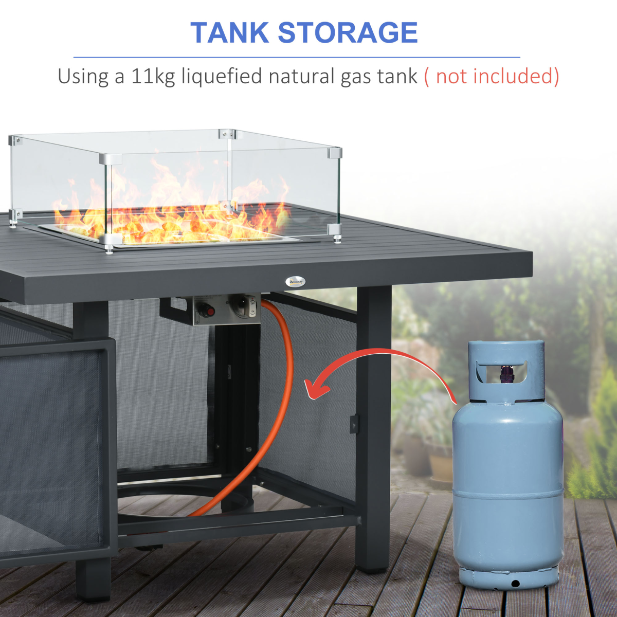 Fire pit table: Great for evenings and milder months. Wind guard for safety, with a 50,000 BTU output - you can keep warm as you sit around this garden sofa set. Aluminium table top is sleek and easy to clean.Six-piece set: Comes with two loveseats, corner seat, two footstools and fire pit table. Sits up to seven - great for bringing everyone together.Aluminium frames: Powder coated metal garden furniture set is strong and fully supportive. Minimal frames for a simple design, suitable for plenty of outdoor space.Cushions included: Relax in comfort on this outdoor corner sofa set. Zipped covers to remove and wash.Dimension: Loveseat: 78H x 153W x 85Dcm. Corner seat: 78H x 85W x 85Dcm, Footstool: 33H x 75W x 50Dcm, Table: 64H x 105W x 105Dcm. Weight Capacity: 120kg(Single Corner Sofa/Footrest),240kg(Loveseat), 50kg(Fire Pit Table). Assembly required.
