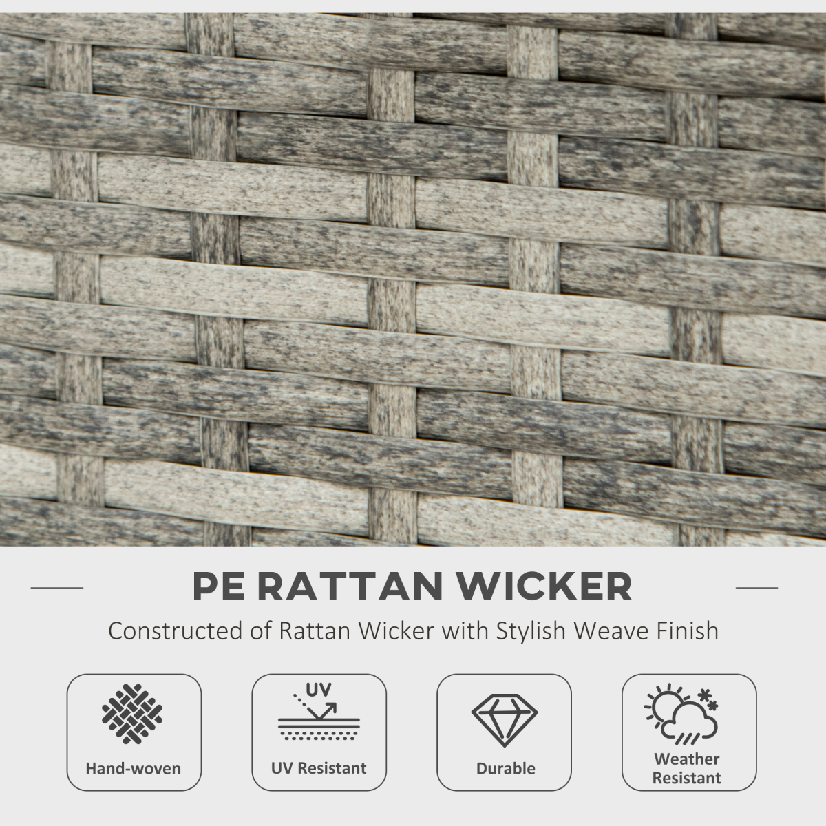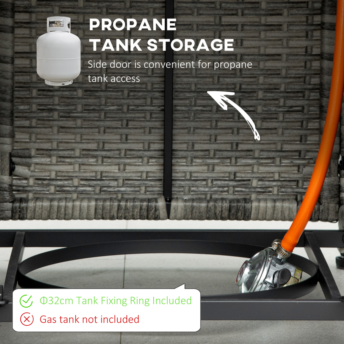 Duo design, with rain cover: Both a gas fire pit and outdoor dining table - does double the job in one compact size. Lid to cover the firepit when needed as table. Propane tank is required - not included. Protective sheet to shield table against weather damage.40,000 BTU burner, with smokeless fire pit: Clean burn, helps to retain the warmth longer. Electronic ignition system to start, with flame adjustment knob.Safe: Fire pit table features a thermo thermometer (thermocouple) - senses when the flame goes out/drop in temperature and closes the valve. Protective spark guard mesh for flying sparks.Rattan-effect body: A garden-beautiful gas fire pit table, effortlessly matches with your other furniture.Dimensions: 71L x 71W x 63Hcm. Regulator and hose included. Assembly required.