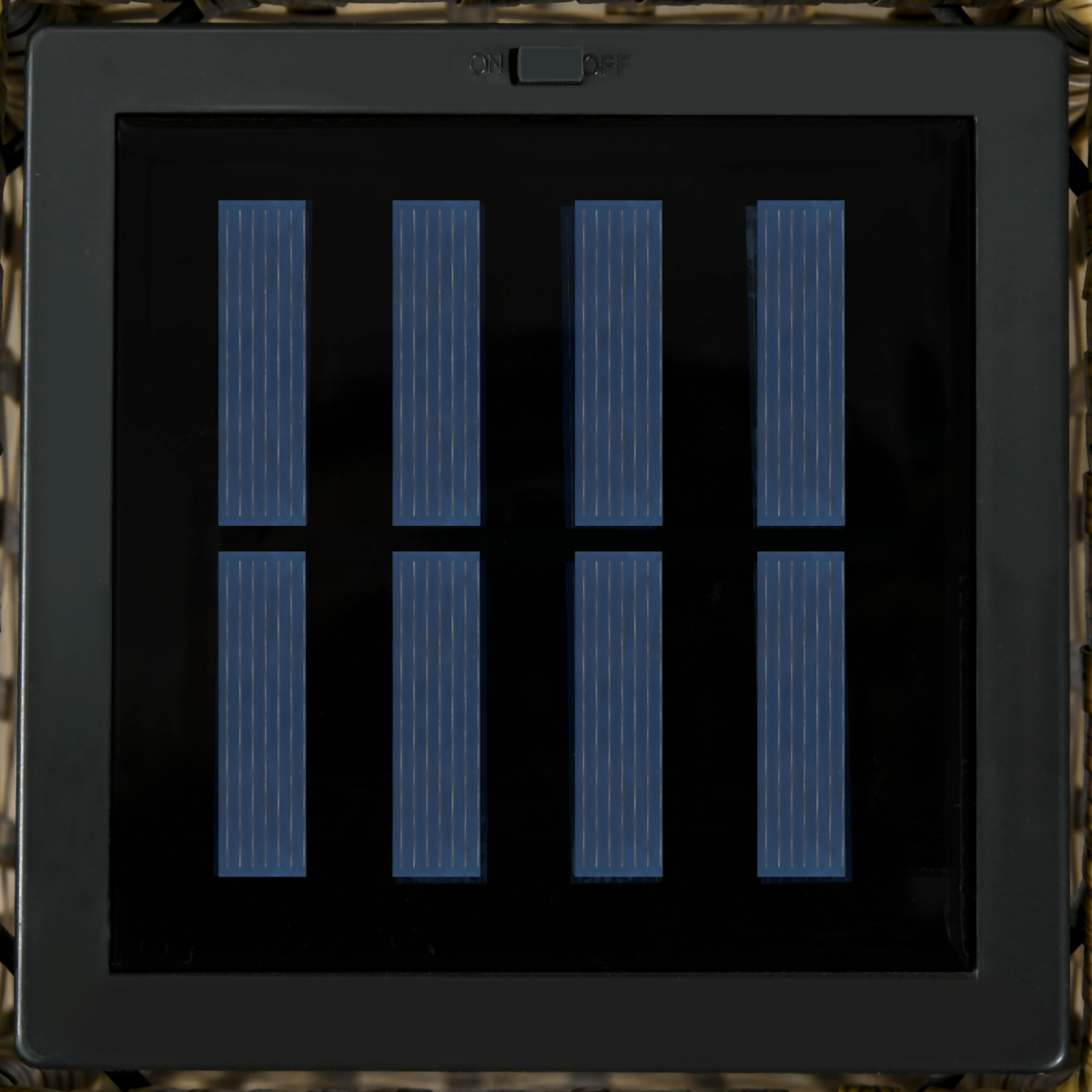 Solar powered: Top panel on this rattan floor lamp charges when sunlight is available during the day. Uses stored power when dark. Rattan solar lantern lasts for eight hours with full charge.15 lumens, warm white LED: 2500K colour temperature, this rattan lamp brings plenty of light to illuminate the area, so you can see better in the dark.Steel frame, wrapped in rattan: A garden-ready look. Metal casing for strength, wrapped in plastic wicker for double the durability.Tall, caged design: Something different for your outdoor space - looks great and blends in with the surroundings.Dimensions: 78H x 21W x 21Dcm. Light: 2W x 12Dcm. IP44 water-resistance rating.