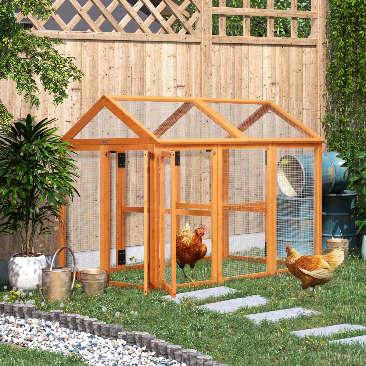 Spacious duck coop: Small animals will be comfortable and relaxed, where they have lots of room to roam and stretch their wings. Large enough for 3-6 chickensEasy access: Includes multiple doors, so it's easy to get in and clean this chicken run.Combinable: Get more coops and attach them together, creating an even larger space for your flock.Dimensions: 106H x 140L x 88.5Wcm.Suitable for 3-6 chickens. Assembly required.
