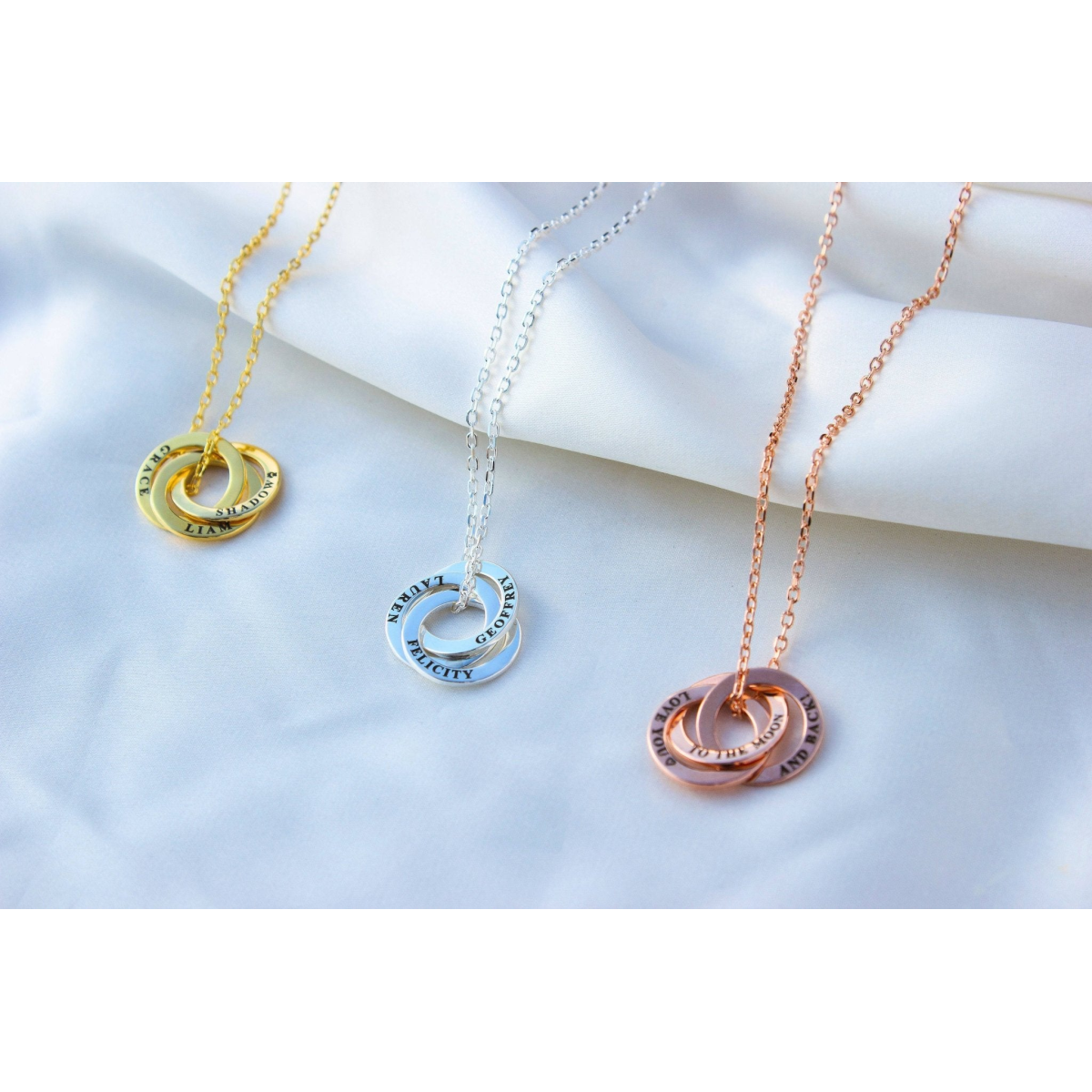 Russian Ring Design: Three elegant interlocking circle pendants that can be engraved with your choice of names, initials, dates, or words.
