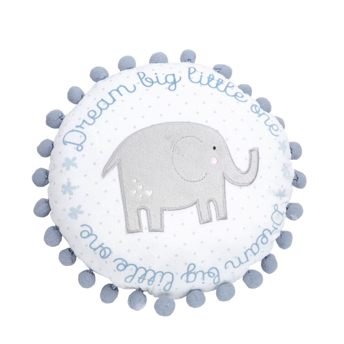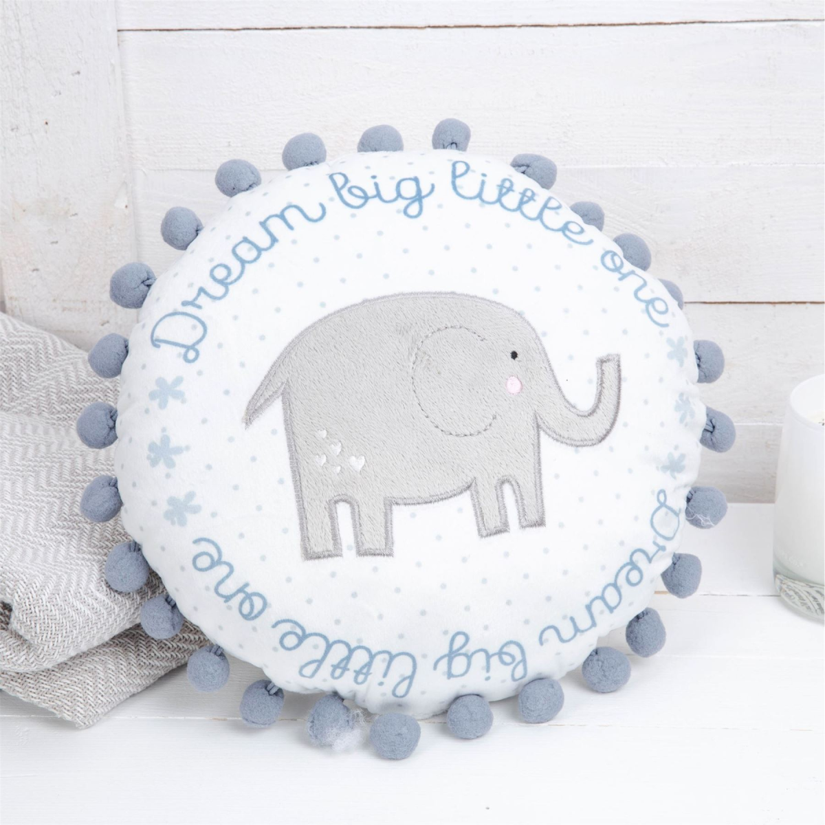 This super soft 30cm fabric cushion features a cute grey elephant design with blue border lettering and blue bobbly trim around the edge.