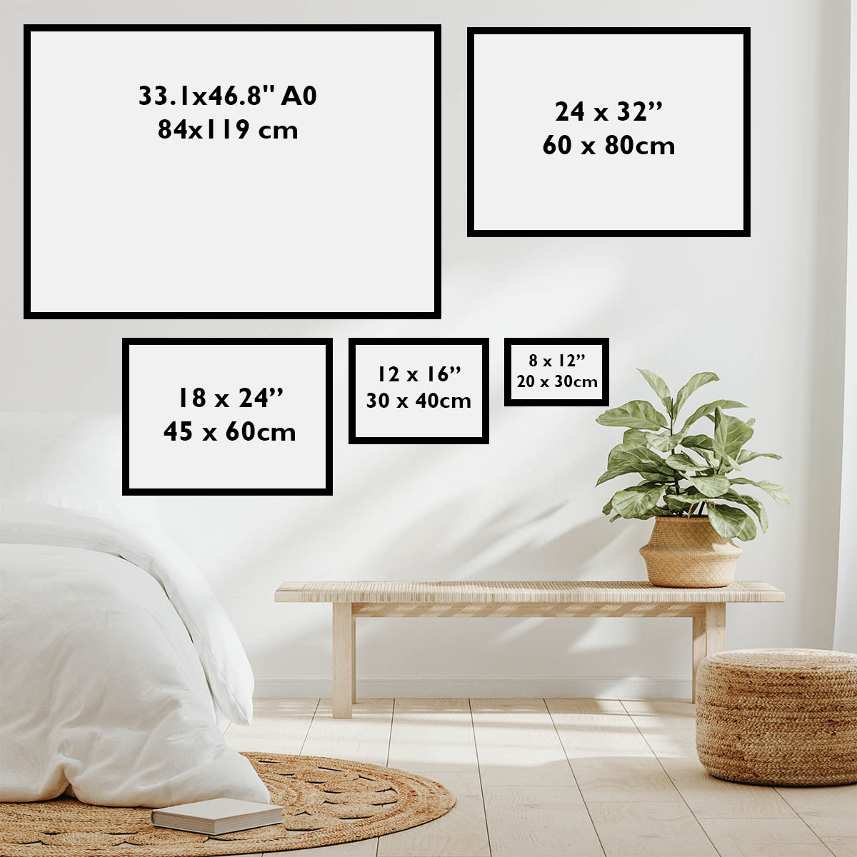 Framed Print: Ready-to-hang in a black wooden frame with perspex glaze, milled with simple clean lines and a satin finish for extra protection. Square profile frame measures 20mm. The size listed refers to the size of the glaze and does not include the width of the frame.