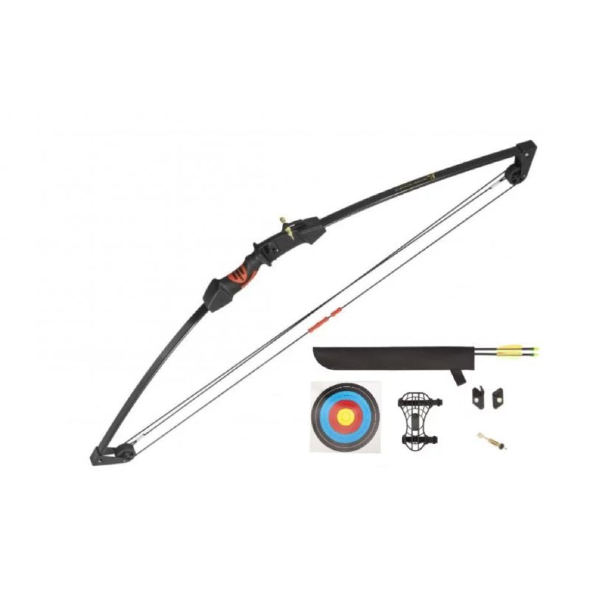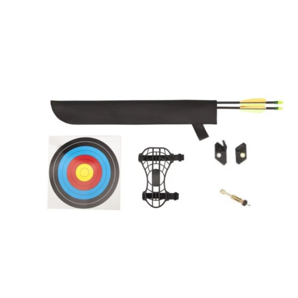 Set contents: 2 fiberglass arrows, eco-leather quiver, archery target, finger protector, classic rest, classic sight, forearm protector, spare rubber inserts for the handle