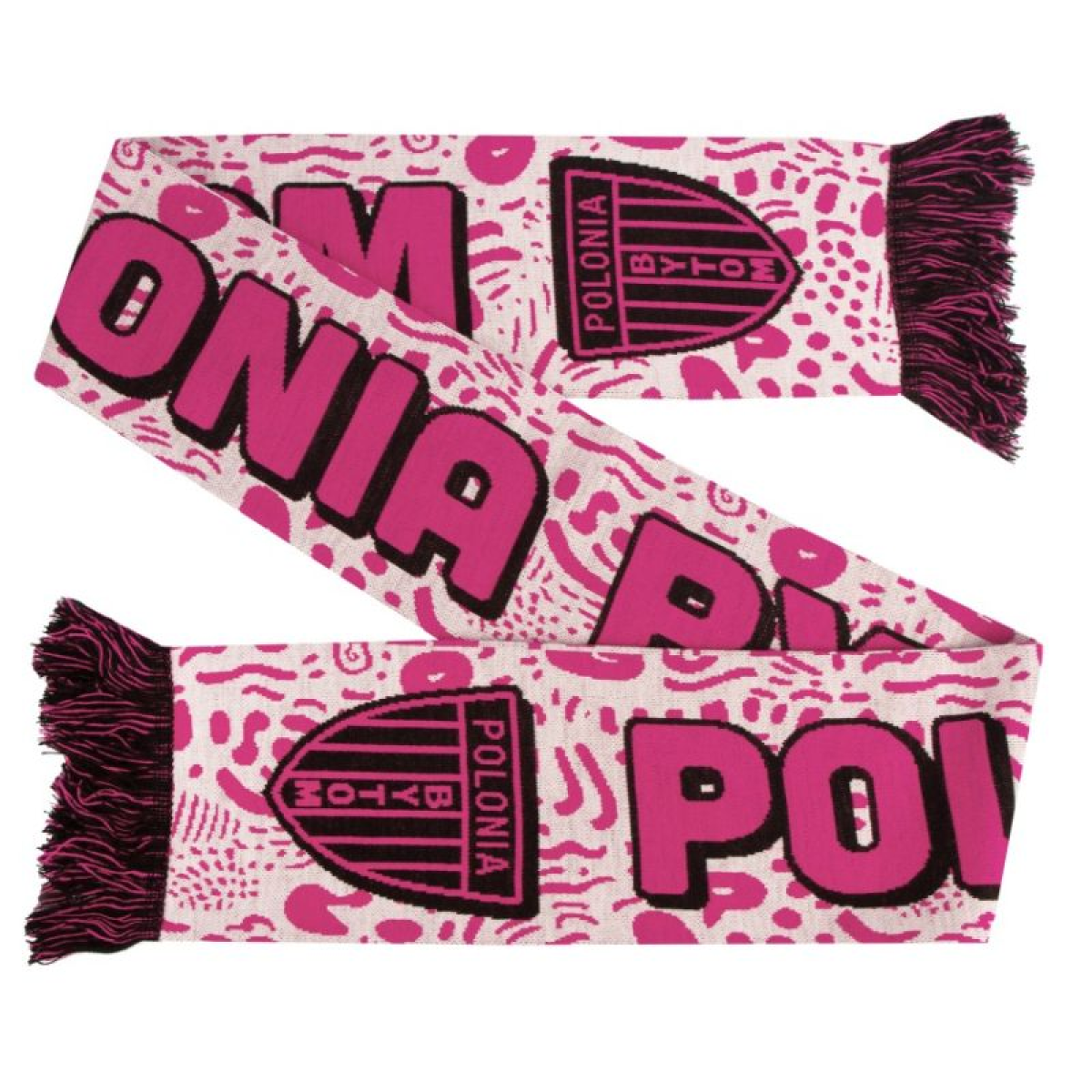 Polonia Bytom PINK Scarf. Stand out in the stands with the club's bold colors. The Polonia Bytom PINK scarf is a unique option for fans who like to stand out from the crowd and emphasize their loyalty to the club in a modern way. The intense pink color combined with contrasting details and a large "POLONIA BYTOM" inscription makes the scarf an immediate eye-catcher. The dynamic, sports-inspired pattern adds character, while the soft material ensures comfort on cooler days. Key features: Unique color scheme: The bold pink design allows you to stand out from the crowd and adds a fresh touch to your fan style. Large club inscription: The legible "POLONIA BYTOM" clearly emphasizes your loyalty to the team. Modern design: Graphic details give the scarf an energetic, sporty look. Soft-touch material: Provides warmth and comfort both during matches and everyday wear. The Polonia Bytom PINK scarf is a stylish and expressive gadget that will perfectly complement any true fan's collection.