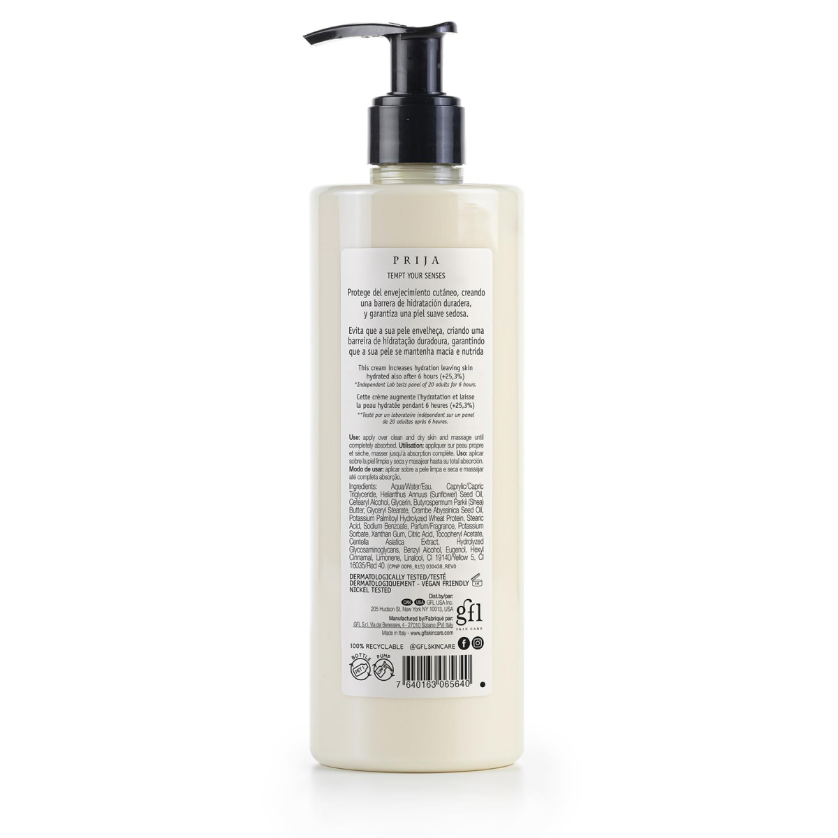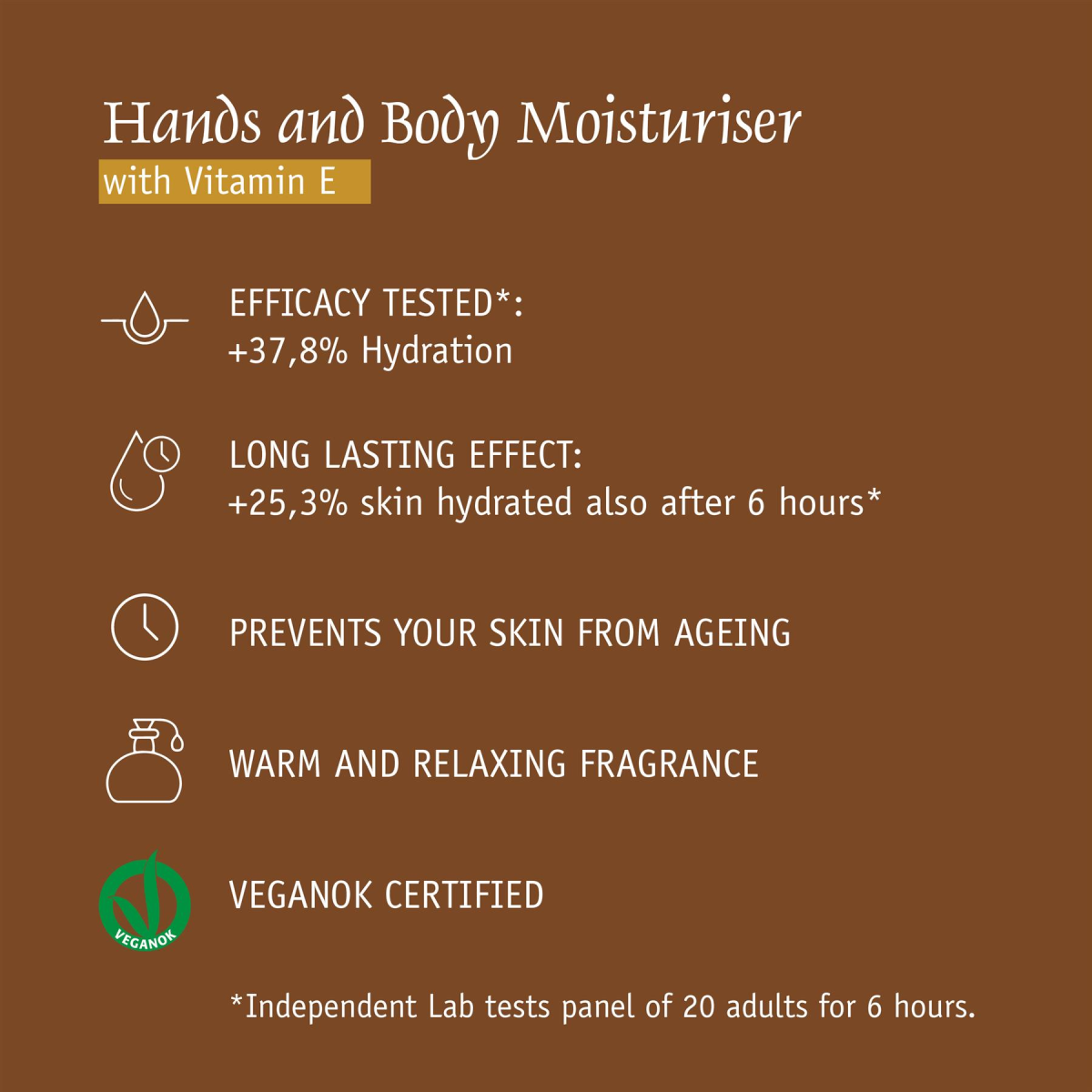 Moisturising hand and body cream with Vitamin E. Creates a moisture barrier that ensures soft and silky skin for a long time. Enriched with Vitamin E and hyaluronic acid precursors to protect against skin ageing and promote correct epidermal hydration. An enveloping fragrance that combines strength and character with a warm and relaxing atmosphere.